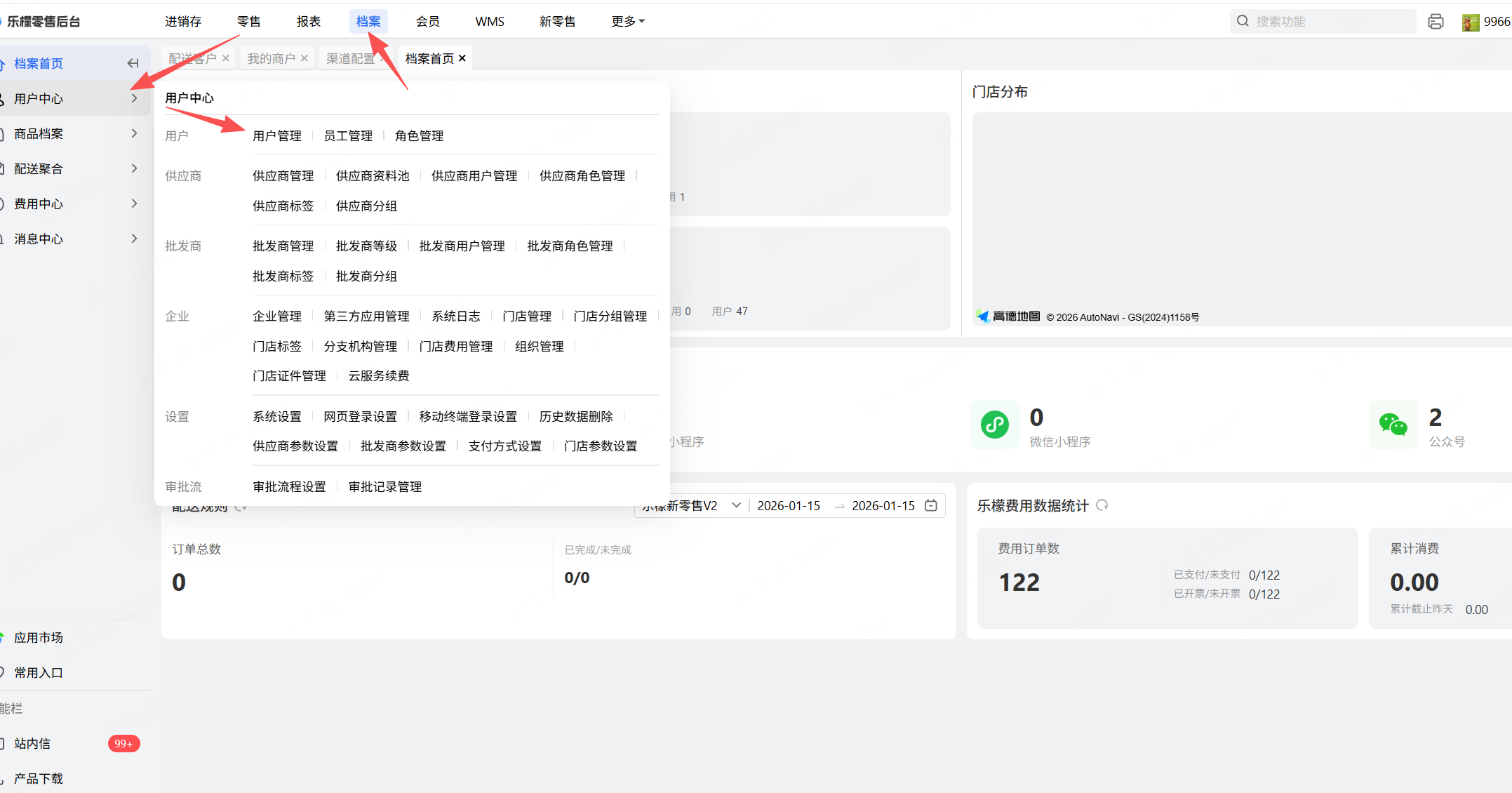 2.检查档案-用户管理-所属商户号-是否添加了要查询的门店(改为空,默认查询所有门店)