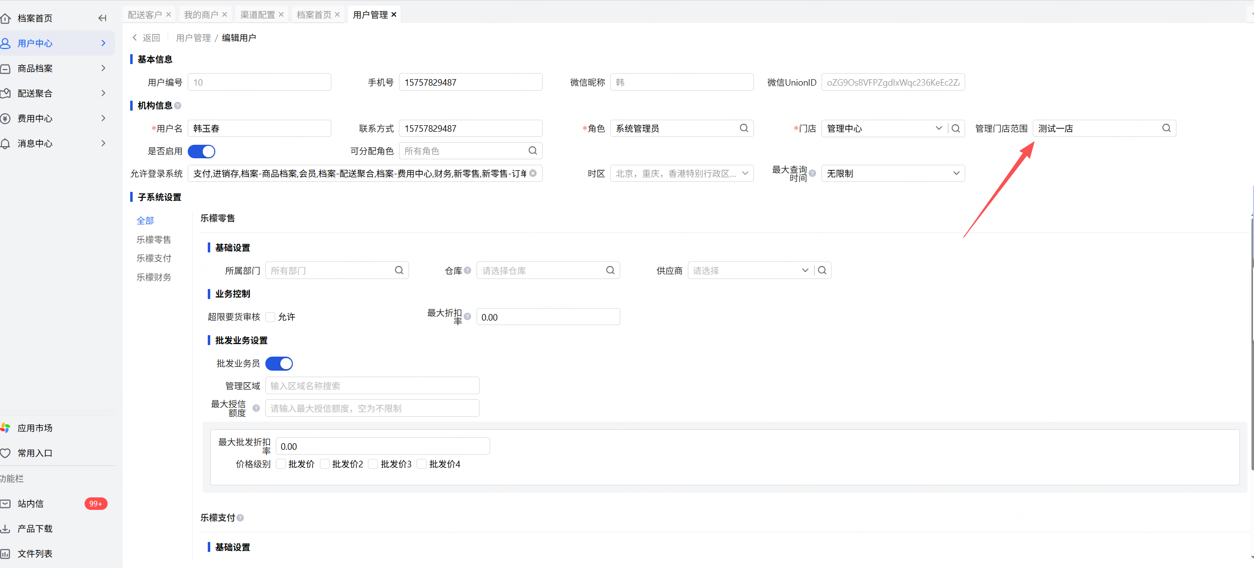 乐檬支付WEB端用户可查看和设置的数据范围需要根据用户设置中的设置进行处理(乐檬支付->子商户选择范围)