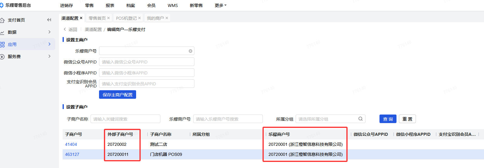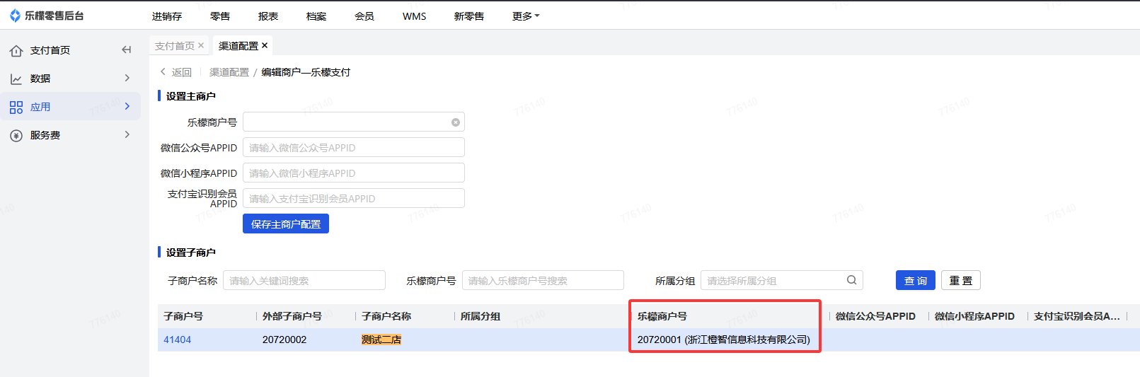 进入到支付渠道中,即可看到门店做设置的对应商户号,如下图测试二店所设置的商户号为:20720001