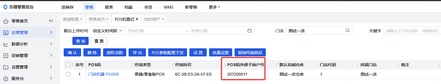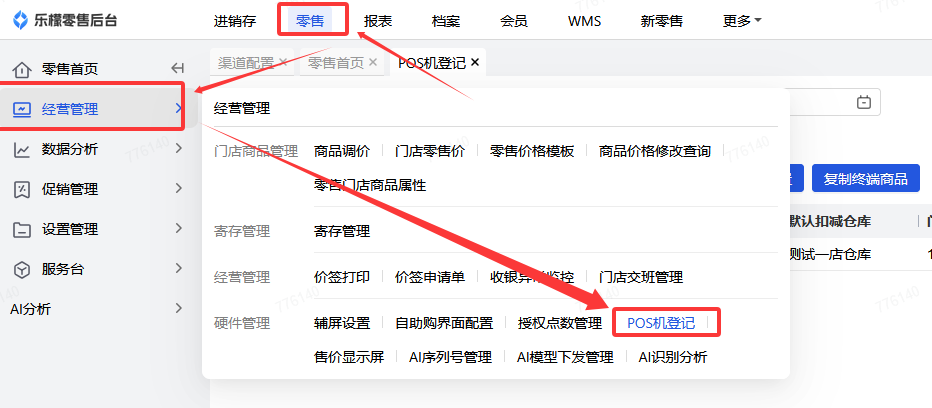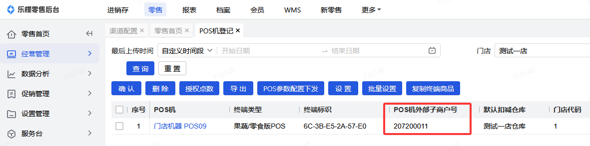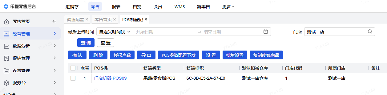 👉【操作路径】:1.零售-经营管理-POS机登记