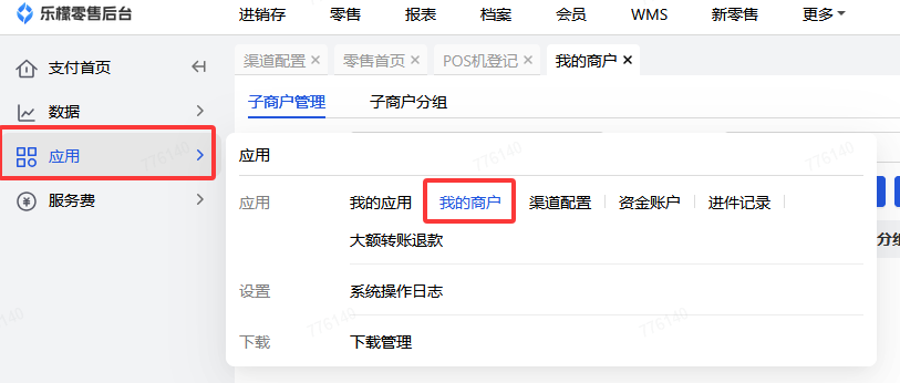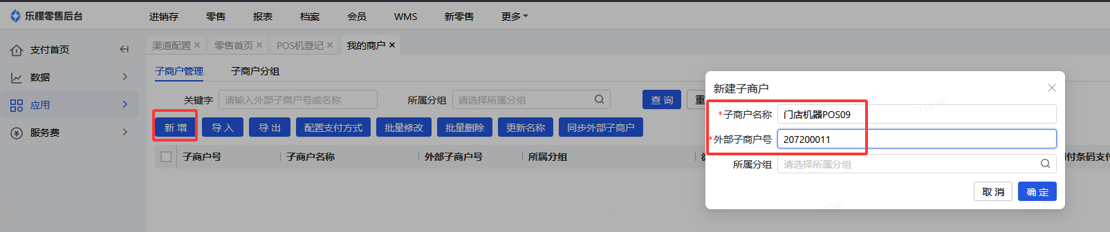 再将POS机外部子商户号添加到支付-应用-我的商户中