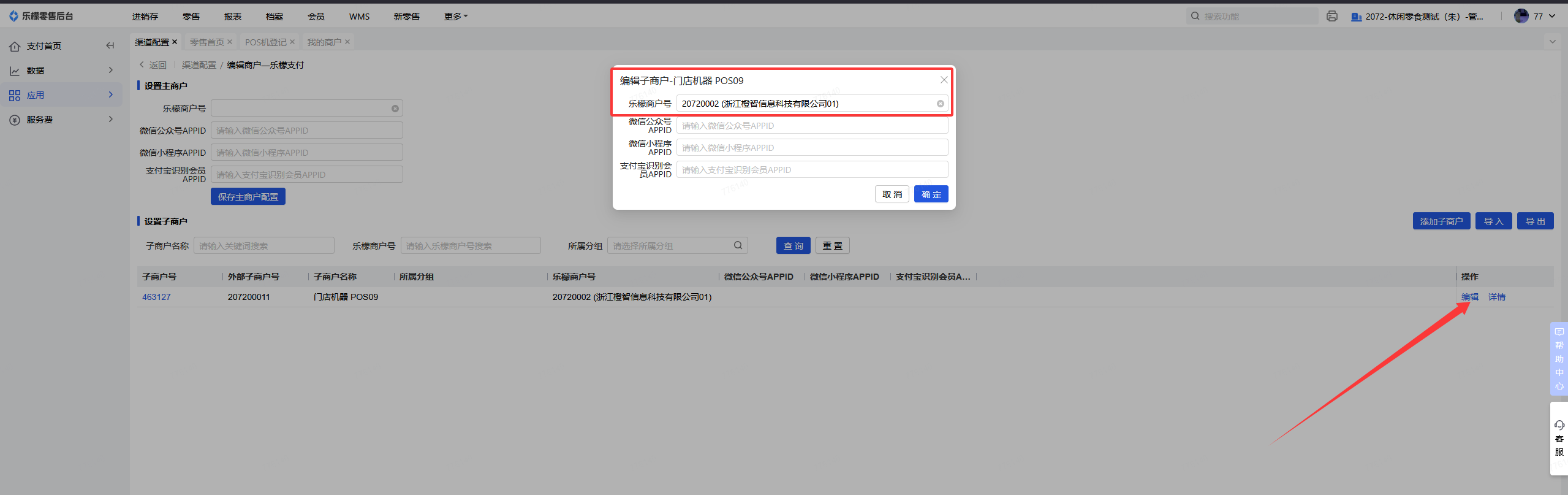 最后再到“渠道配置-乐檬支付”中添加门店子商户号,进行配置乐檬商户号