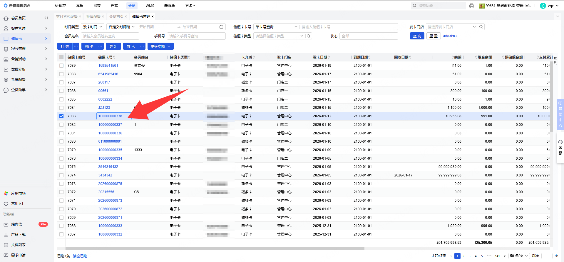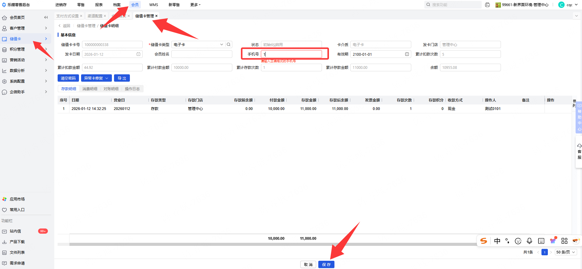 2.后台修改,进入到乐檬零售后台-会员-储值卡-储值卡管理-查询到对应会员后-点卡号进入-直接修改手机号保存