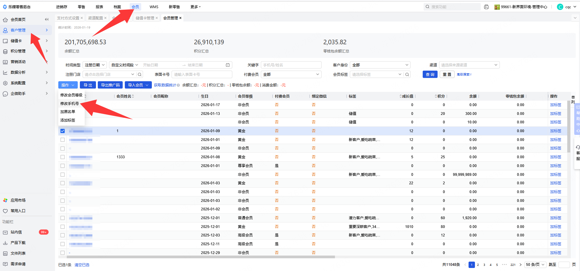 3.会员-客户管理-会员管理-操作里面-修改手机号码,不过这里需要新手机号未注册过才行