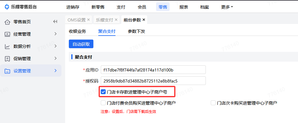 在支付聚合设置中勾选参数”门店卡存款进管理中心子商户号“后前台POS机进行数据同步,此后前台POS机的会员卡充值金额在次日将会直接进入总部的账户