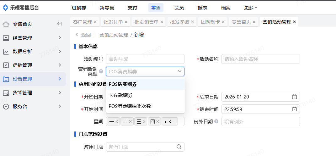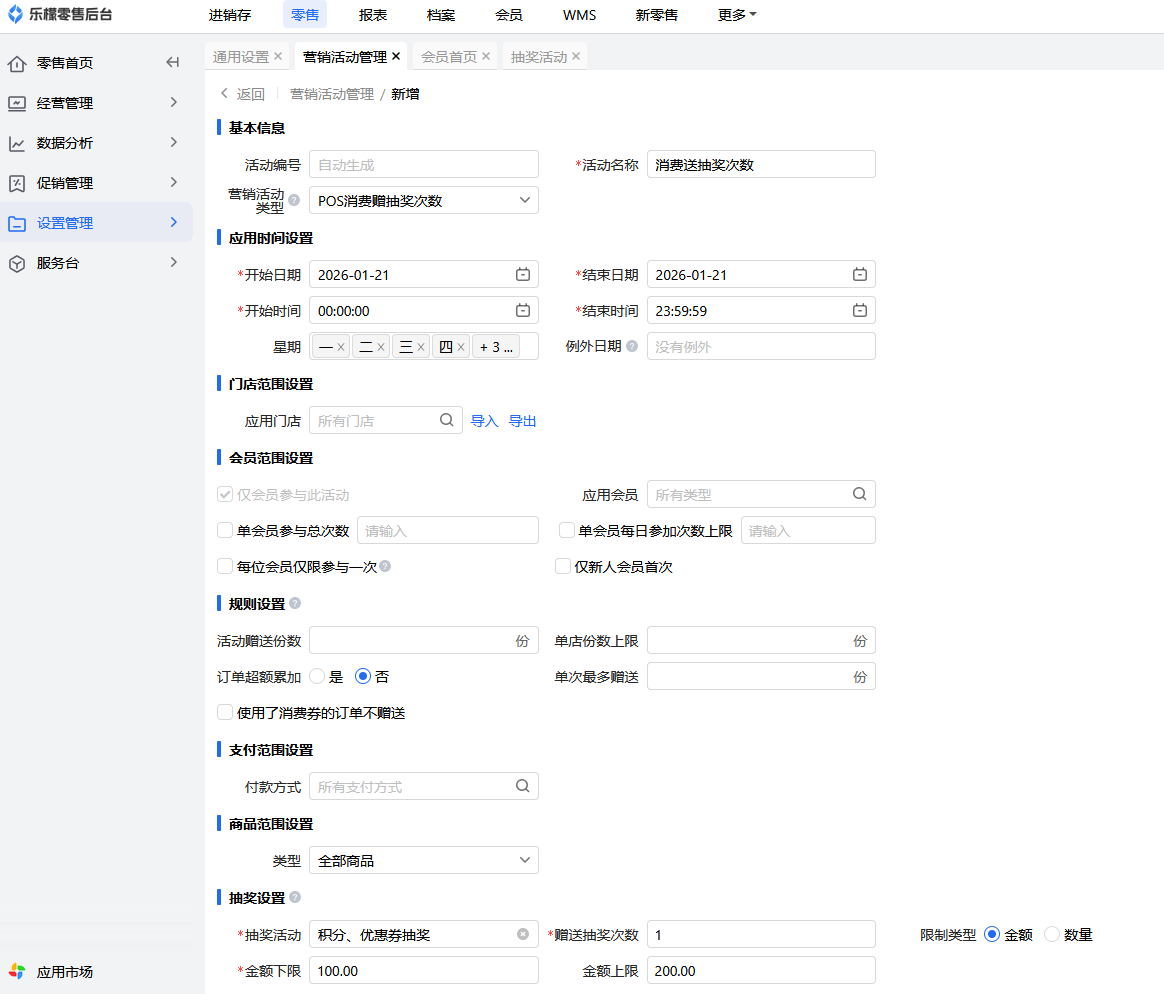 👉【操作路径】:零售-设置管理-营销活动管理-新增