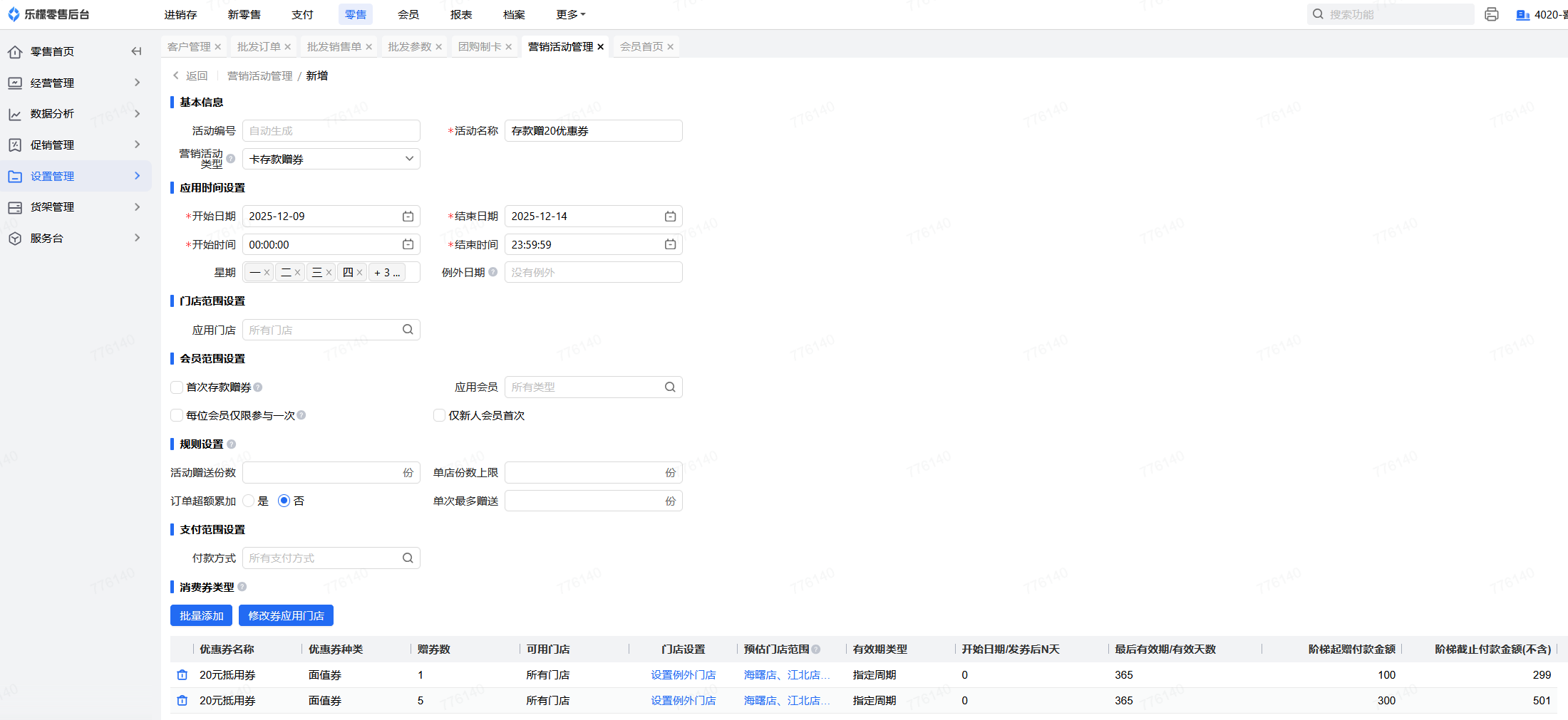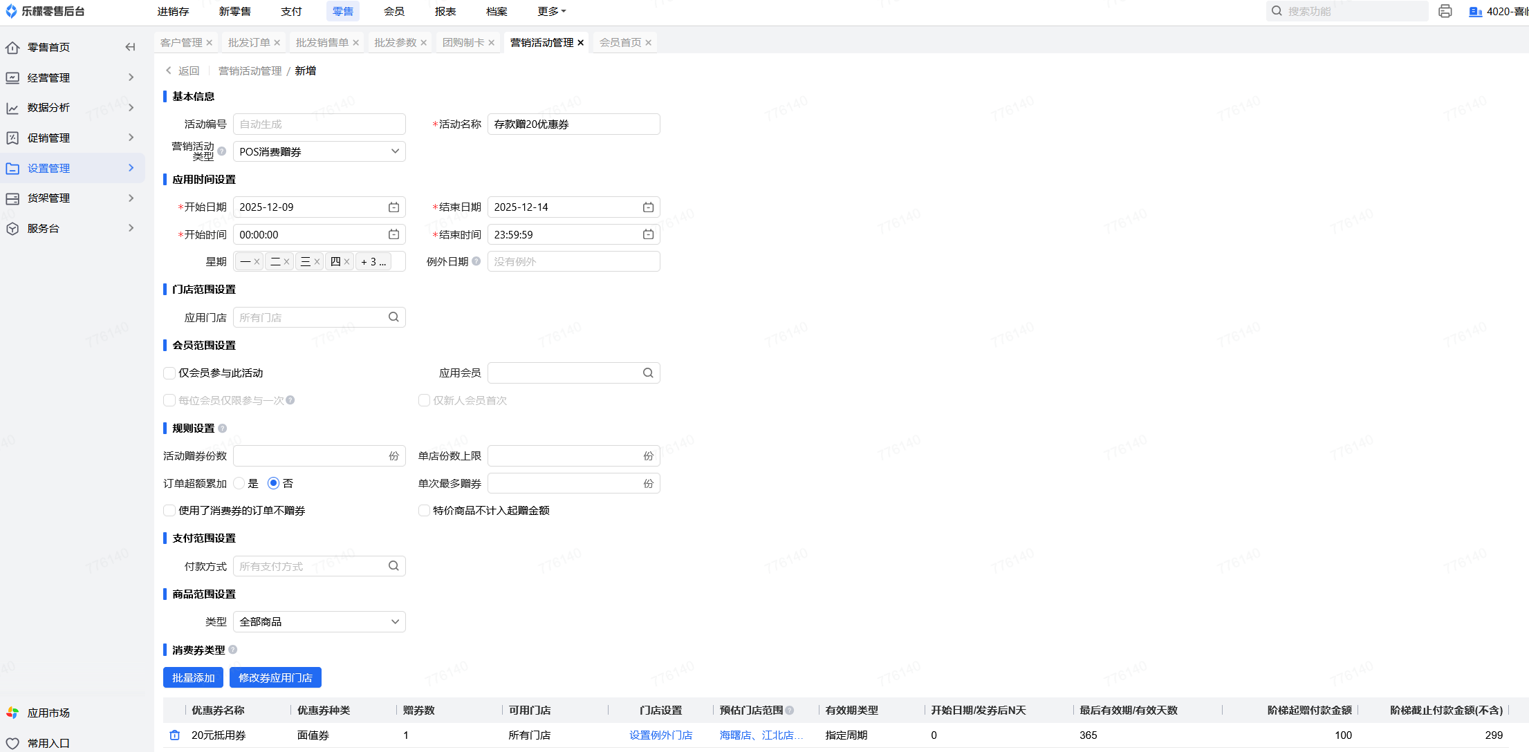 如设置全场商品消费满100~200时,赠送1张20元优惠券,需要将营销活动类型设置为”POS消费赠券“,商品范围类型设置为”全场商品“,添加优惠券,并设置优惠券的有效期、起赠、截止金额,最后确认设置无误后审核,如下图中设置