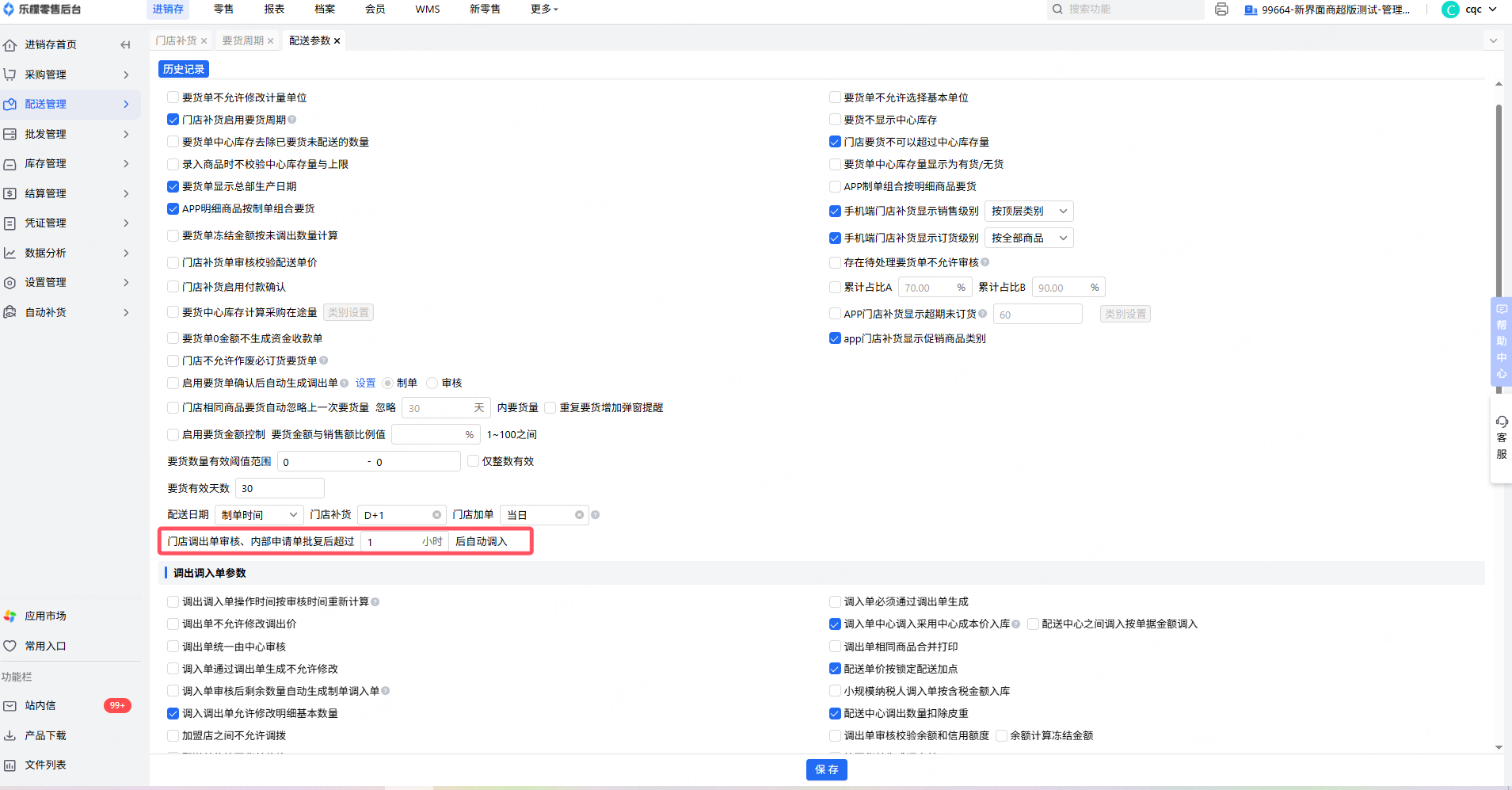 开启“门店调出单审核、内部申请单批复后超过X小时后自动调入”参数,参数设置后,若门店超过X小时未进行单据调入,则相关调入单到了所设置的时间自动调入