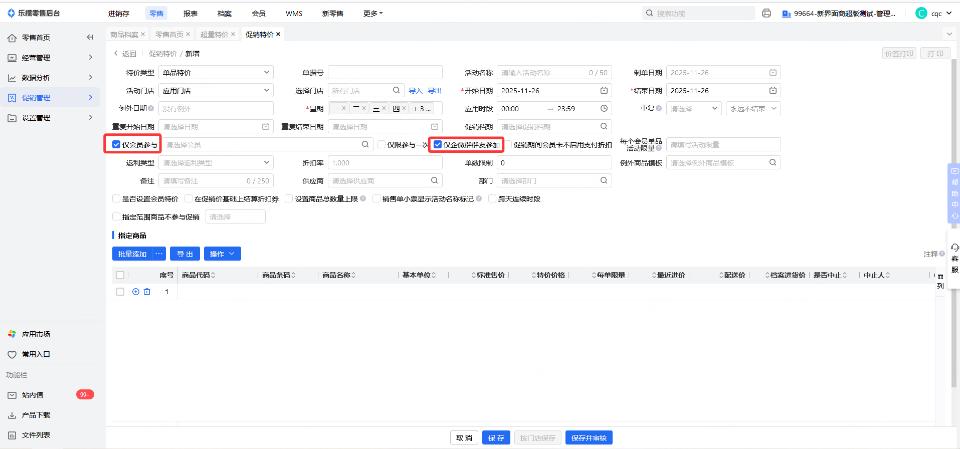 促销特价勾选【仅企微群群友参加】,会员在群内时应用促销特价,不在群内时不应用
