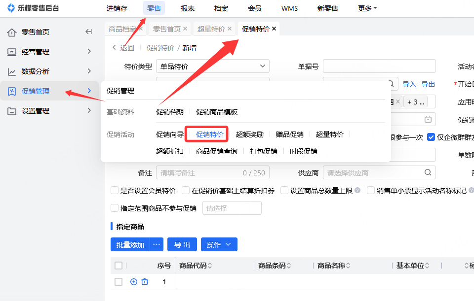 👉【操作路径】:零售-促销管理-促销活动-促销特价