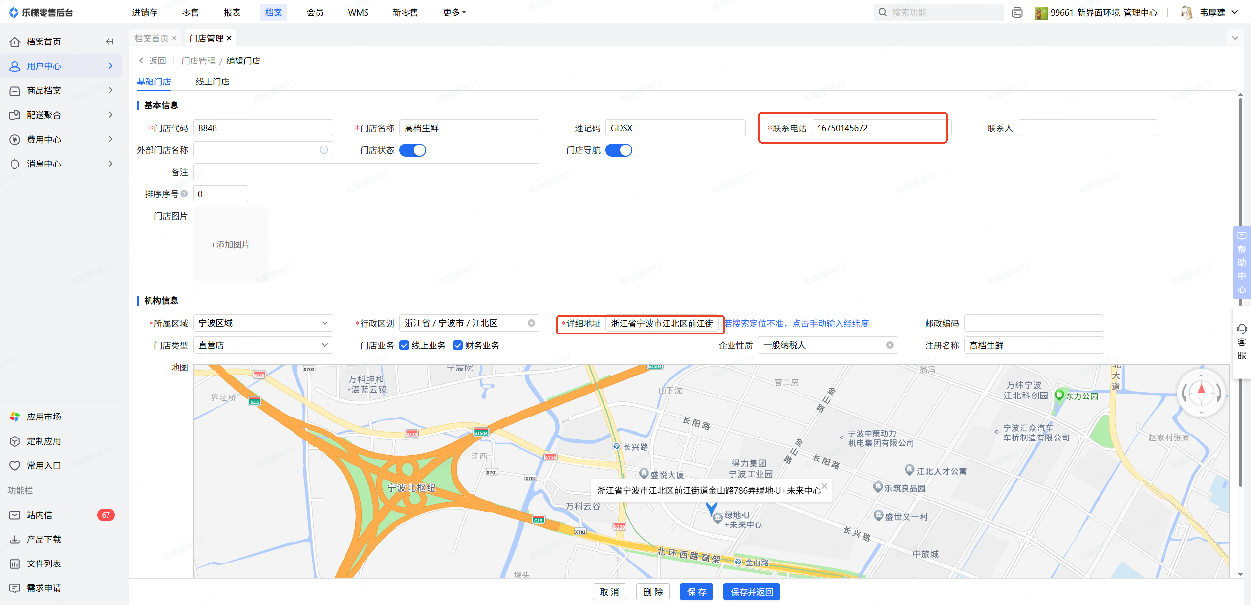 3.对门店地址和联系电话进行修改,修改完成后,进行保存