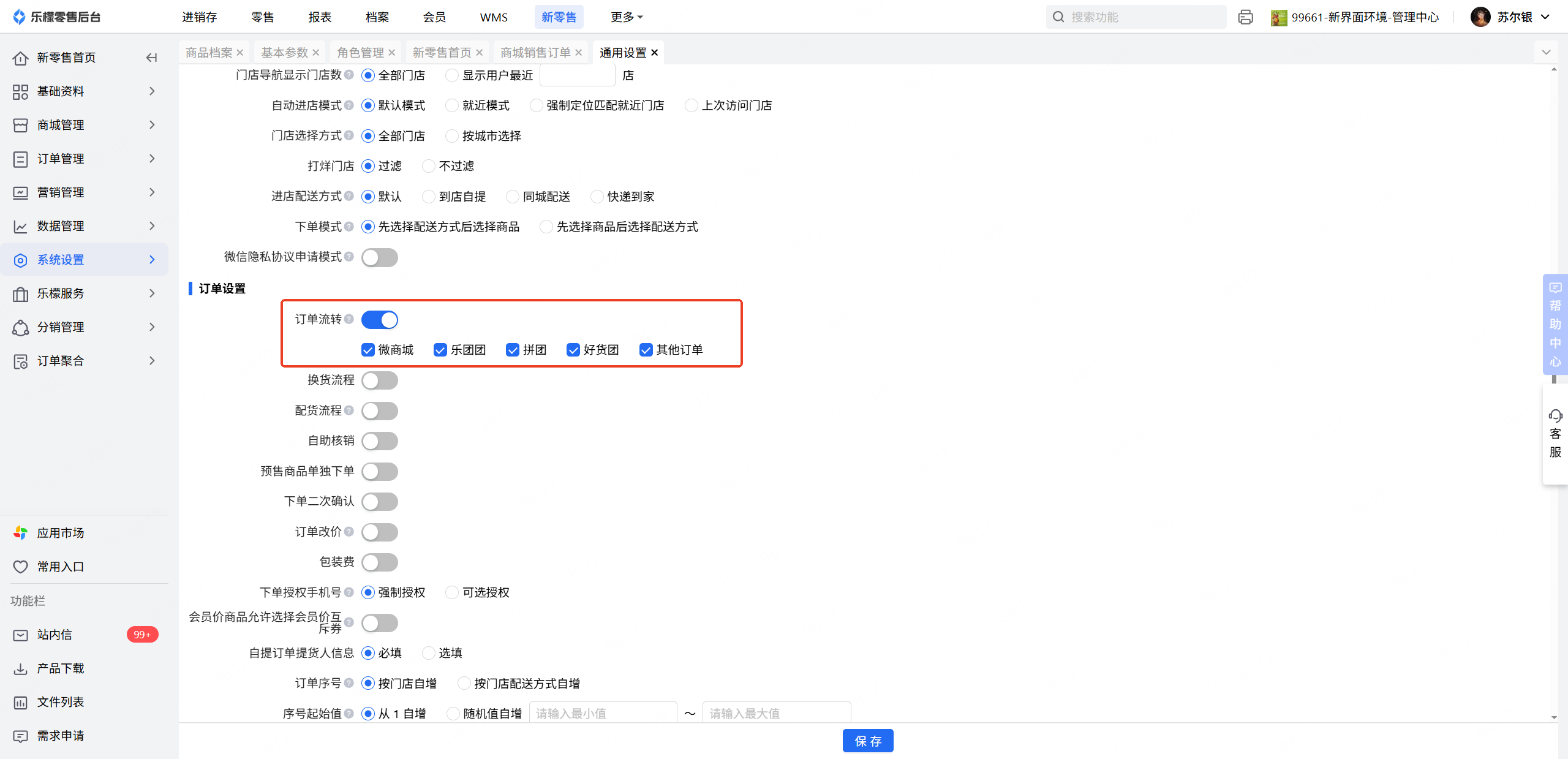 👉【操作路径】:新零售-系统设置-通用设置-订单流转