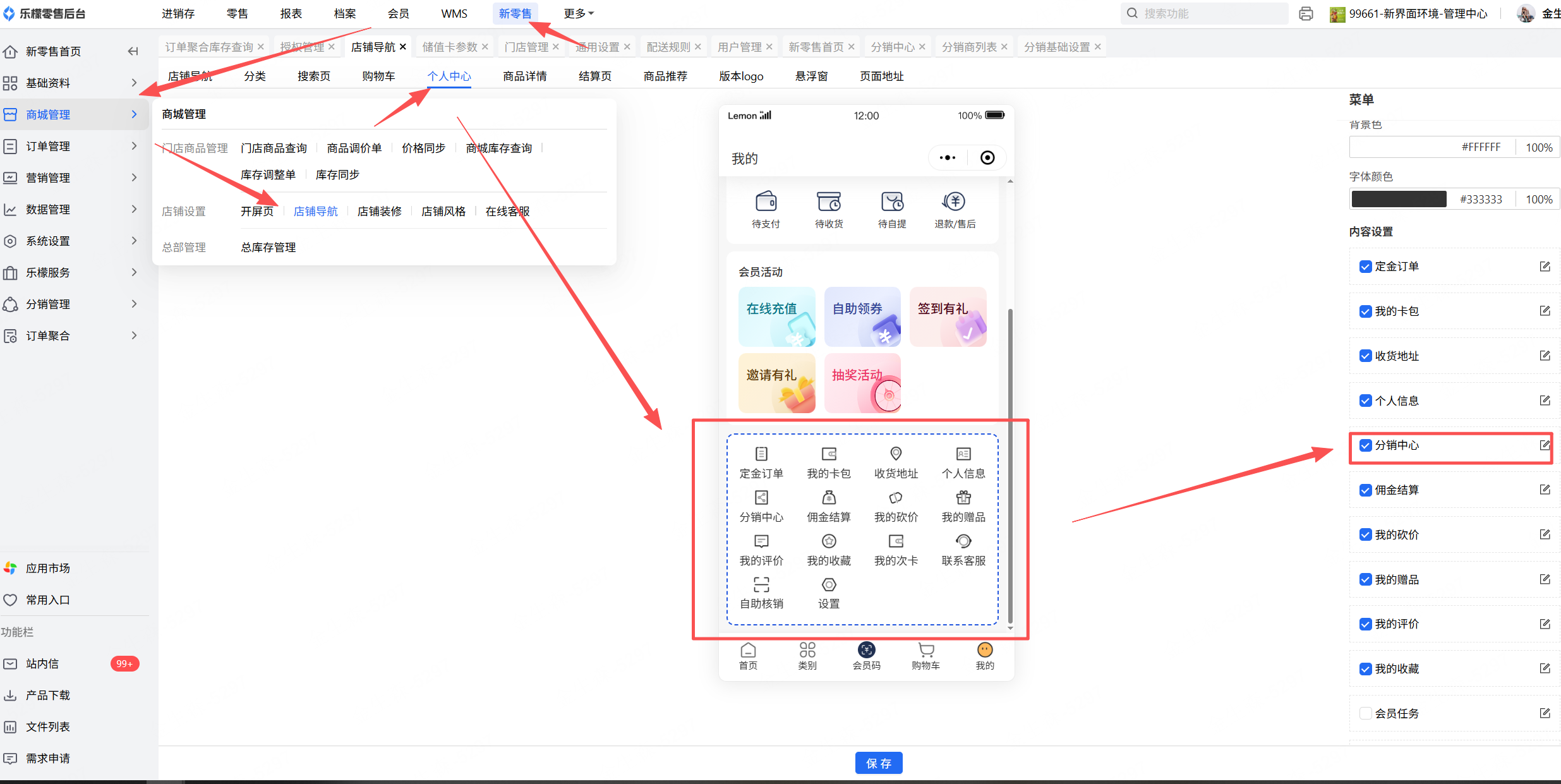 依次点击“商城管理-店铺导航-个人中心”点击最下方功能模块,开启“分销中心”功能