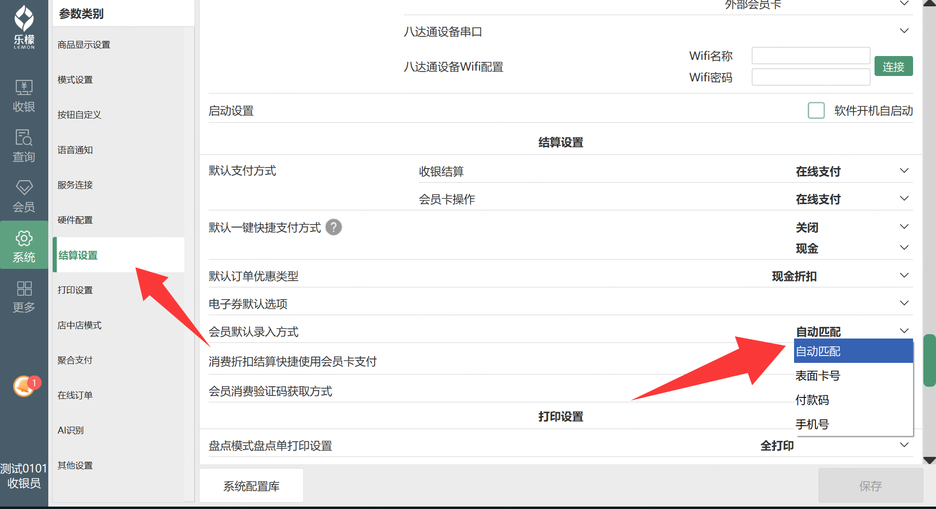 系统-参数设置-结算设置里会员默认录入方式可设置优先哪个