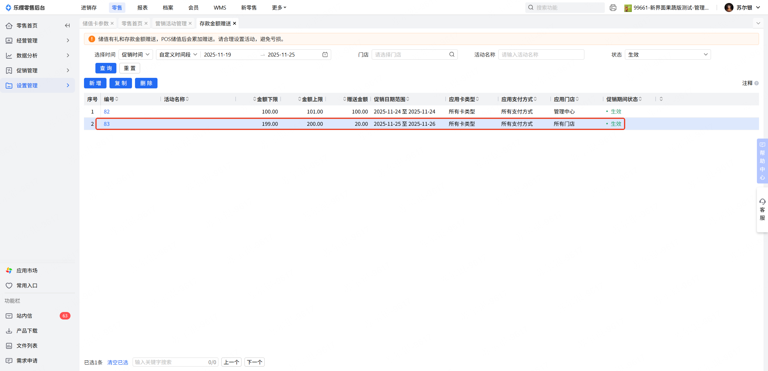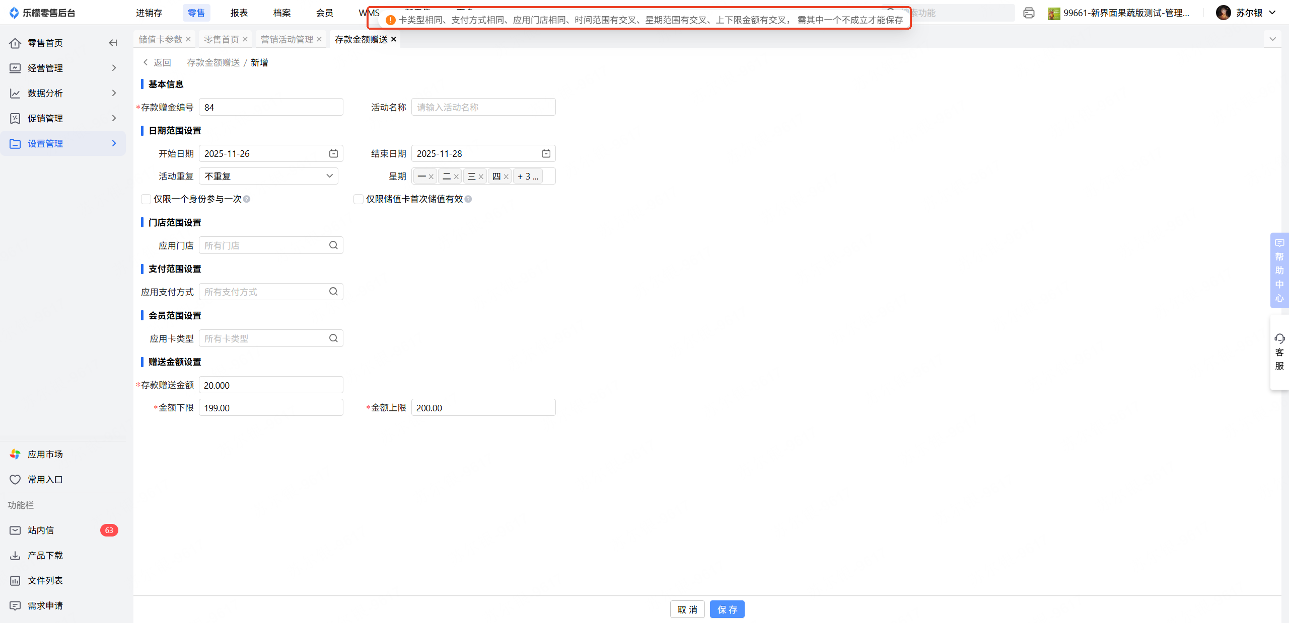这个保存提示说明之前做的存款赠金活动有时间,金额,卡类型已经有活动生成,无法在生成活动