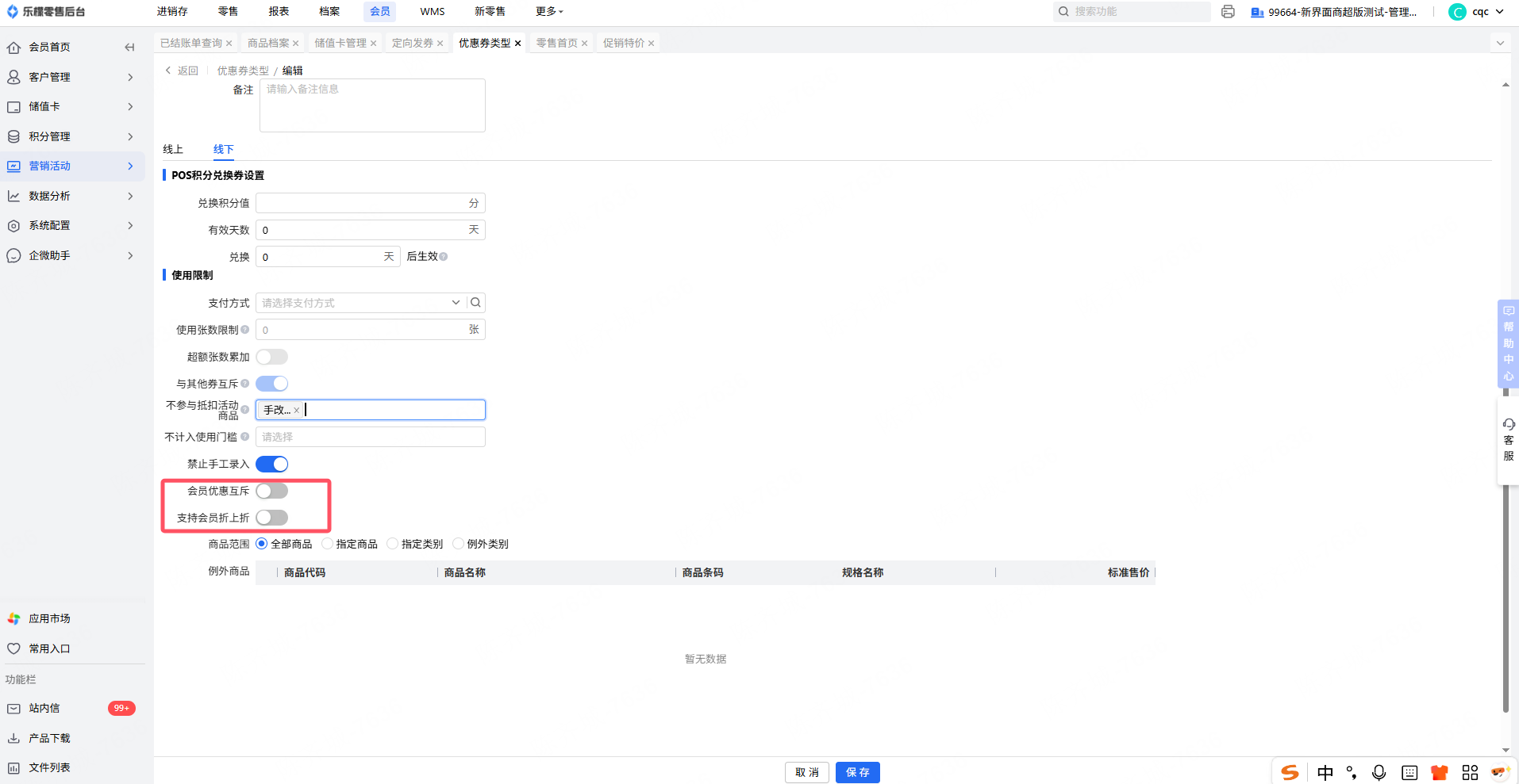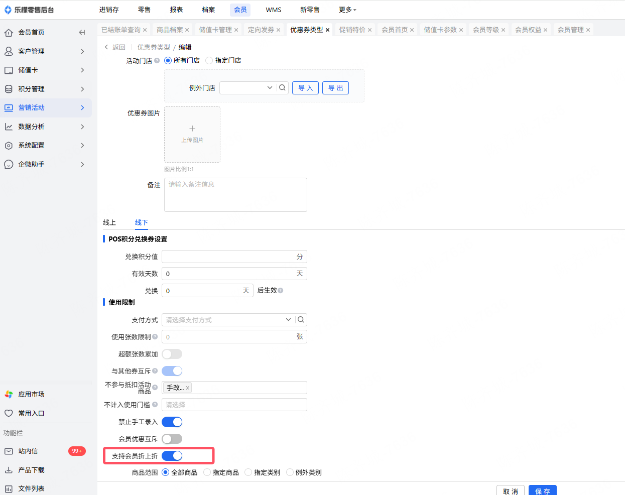折扣券不一样,促销特价默认不能和消费券折上折,会员价能否与消费券折上折看消费券参数是否开启