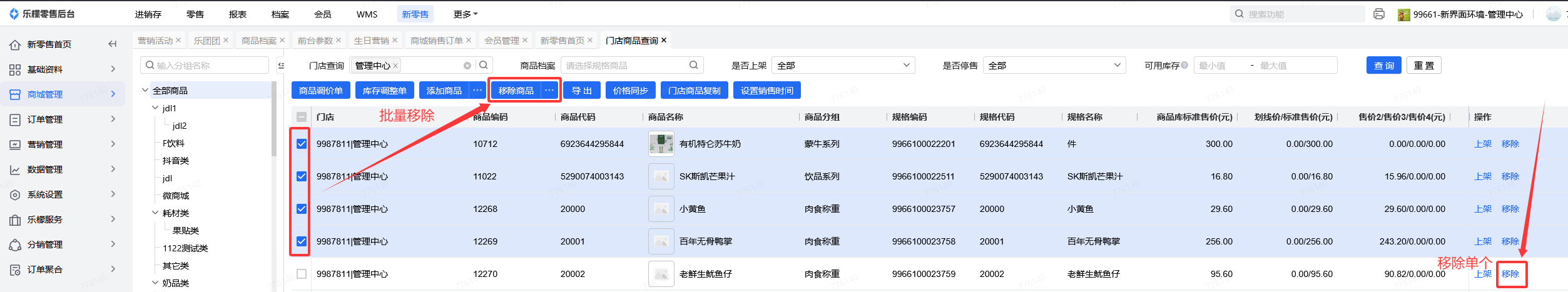 👉【操作路径】:新零售V2-商城管理-门店商品查询-移除