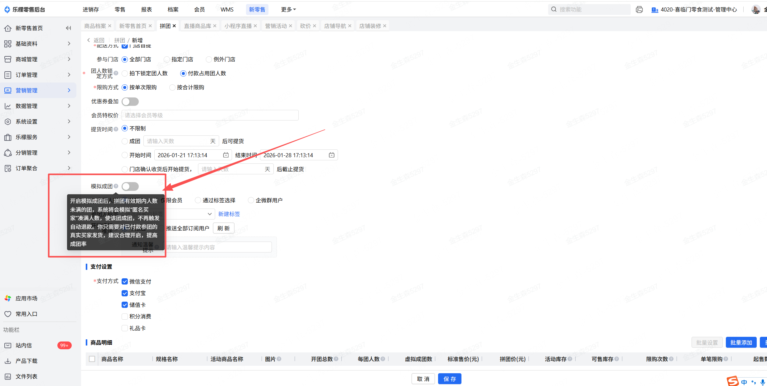 拼团活动开启了模拟成团,然后团人数锁定方式设置的按付款占用团人数,一个团3个人