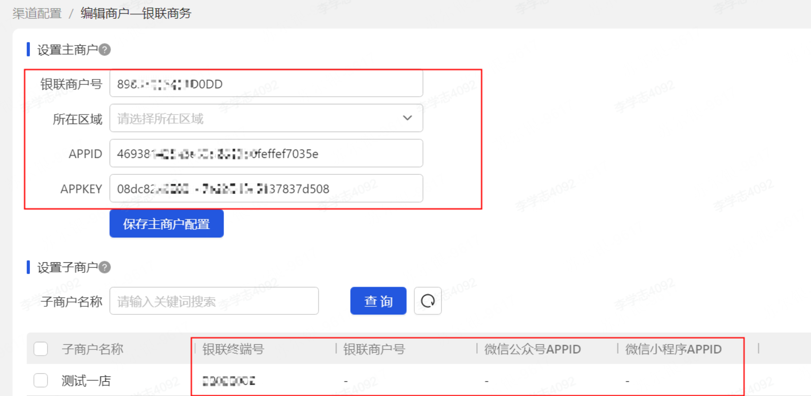 查询对应门店的支付配置有无被变更;支付-应用-渠道配置,点击 对应支付渠道,查询配置信息有无错误。(这里用第三方通道,银联商务举例)