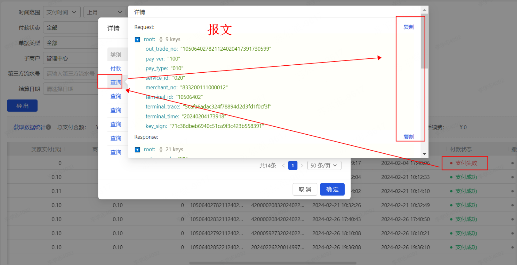 报文:数据-支付记录,点击付款状态列 的支付失败,点击查询,出现的详情窗口就是 报文。可复制递交给第三方支付通道技术人员排查。