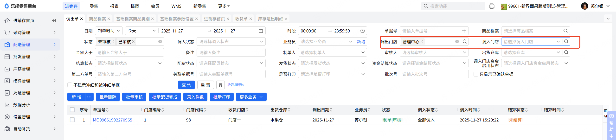 点击高级搜索,选择调出门店和调入门店,门店为:所有门店,输入调出单号点击查询。