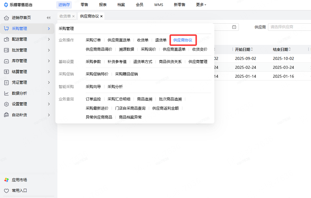 👉【操作路径】:进销存-采购管理-业务操作-供应商协议