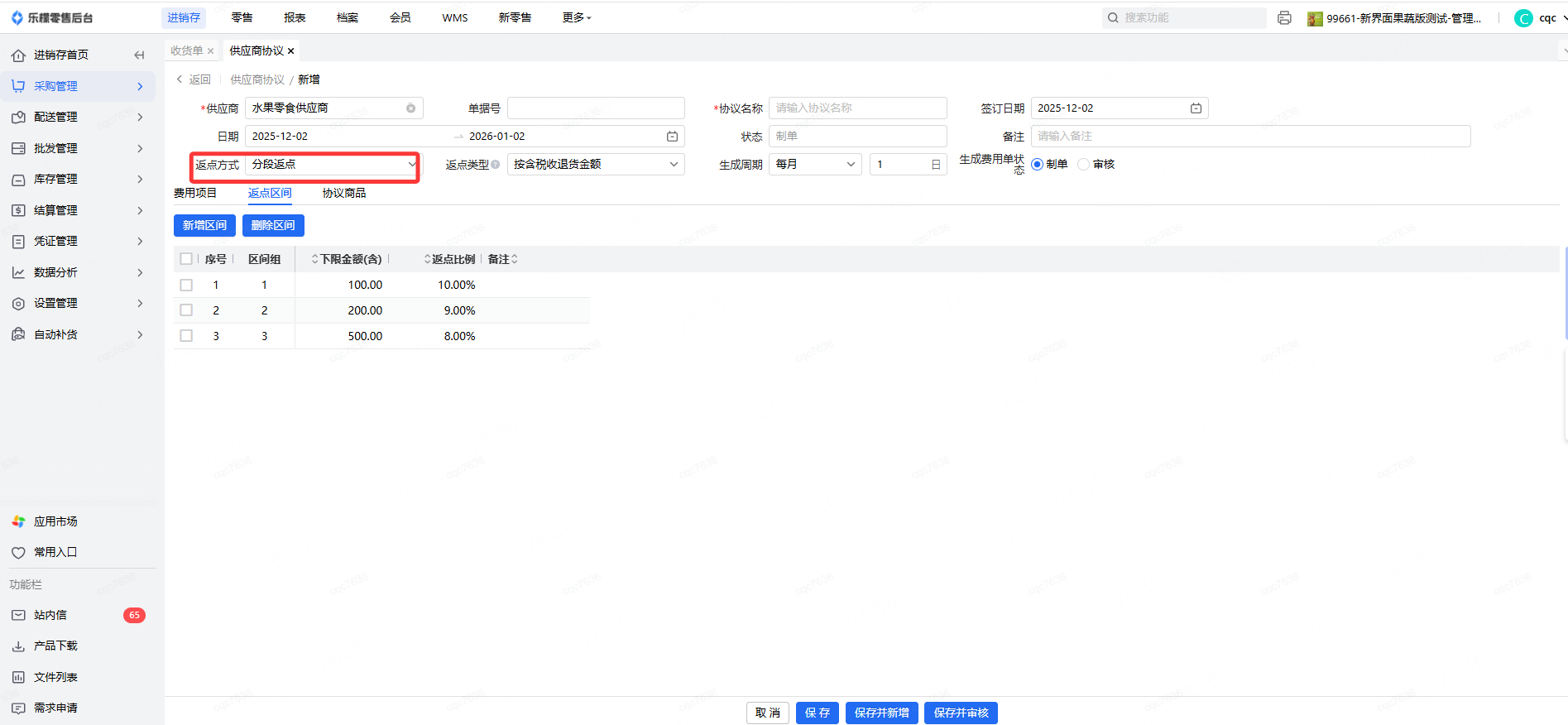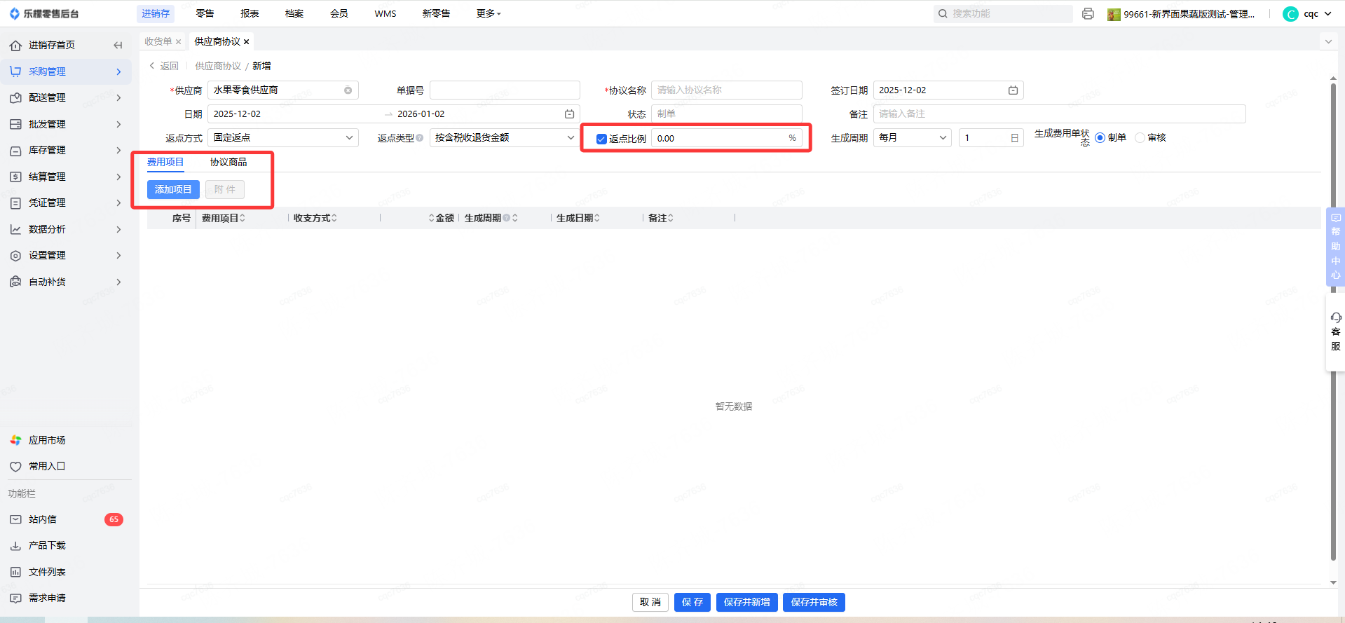 供应商协议功能 用于制订门店与供应商之间的协议,依照协议里的时间在门店生成供应商费用单。