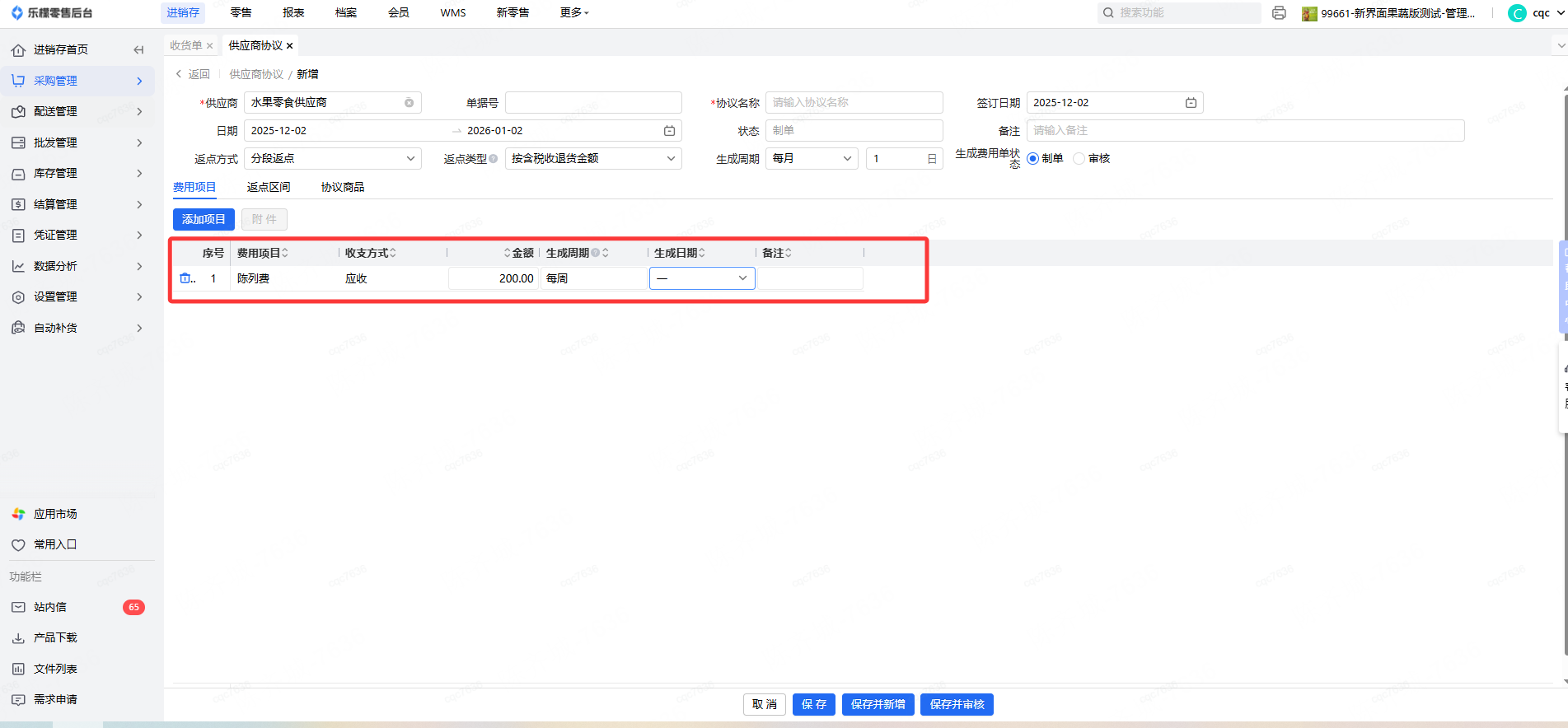 生成周期同返点生成周期,如下图每周一会生成一张费用项目是“管理费”且费用金额为200的供应商费用单。