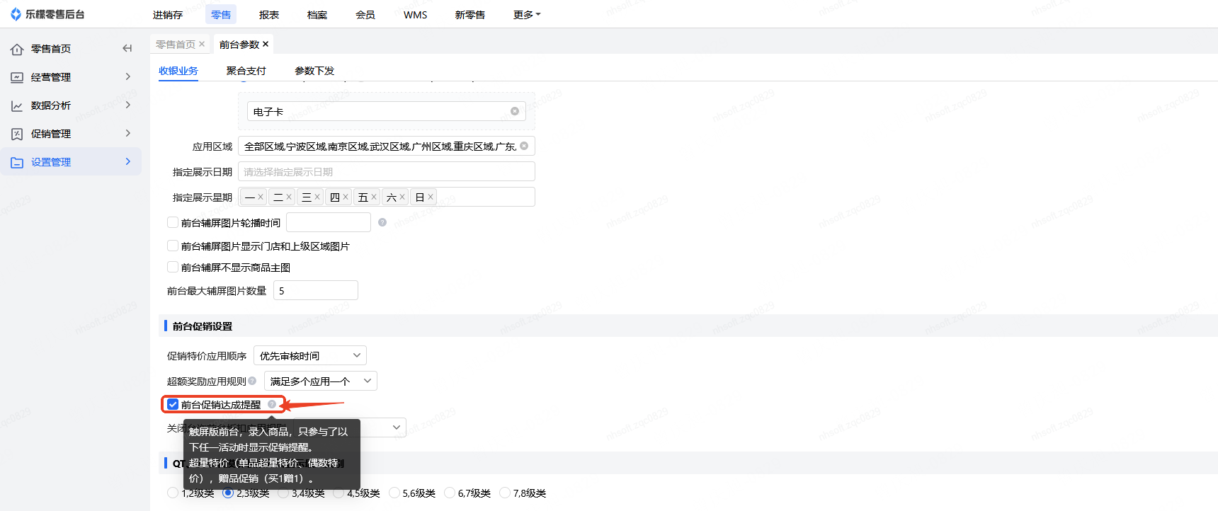 👉【操作路径】:零售-设置管理-前台参数-前台促销设置-前台促销达成提醒