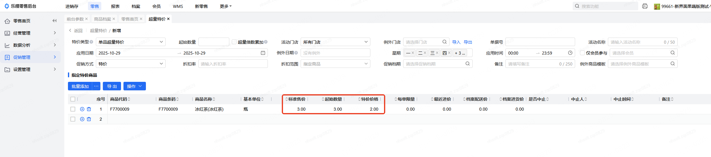 如设置商品超量特价活动,冰红茶原价3元/瓶,单笔购买满3件后2元/瓶的促销活动