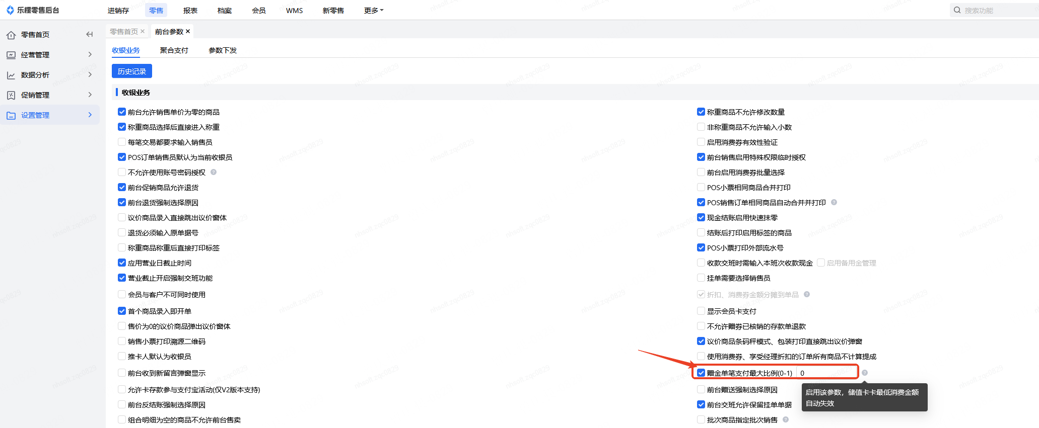 👉【操作路径】:零售-设置管理-前台参数-赠金单笔支付最大比例(0-1)
