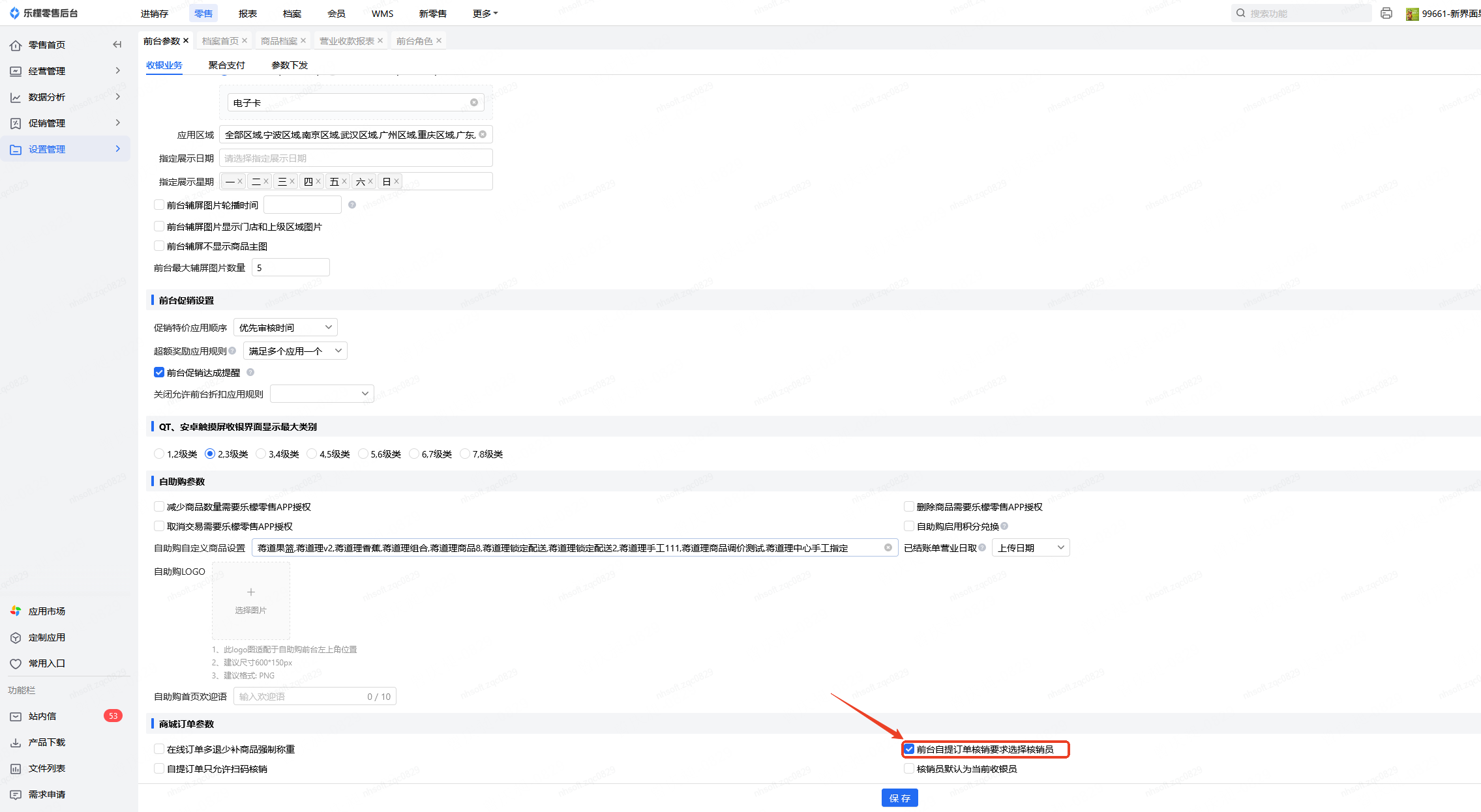 👉【操作路径】:零售-设置管理-前台参数-商城订单参数-前台自提订单核销要求选择核销员