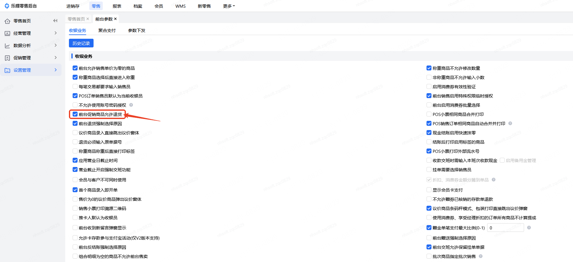 👉【操作路径】:零售-设置管理-前台参数-前台促销商品允许退货