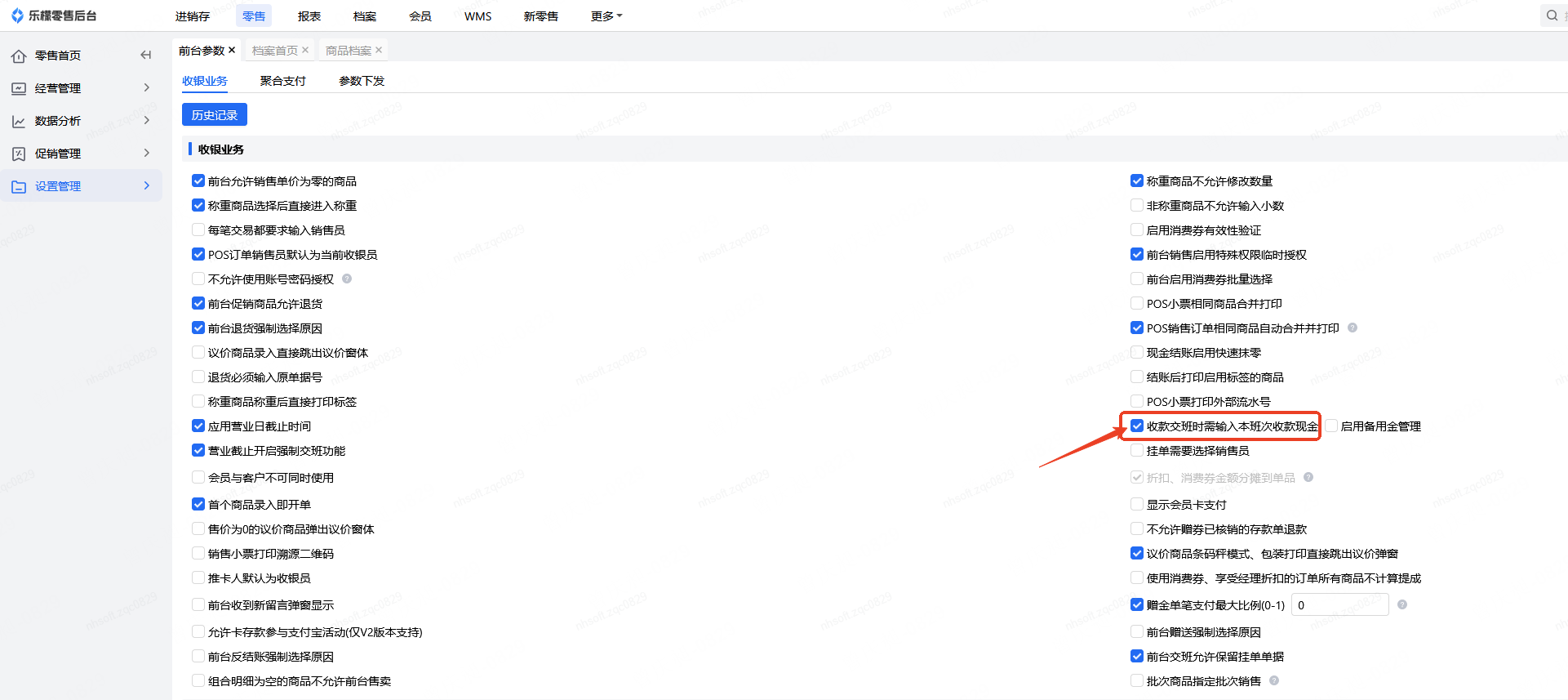 👉【操作路径】:零售-设置管理-前台参数-收款交班时需要输入本班次收款现金
