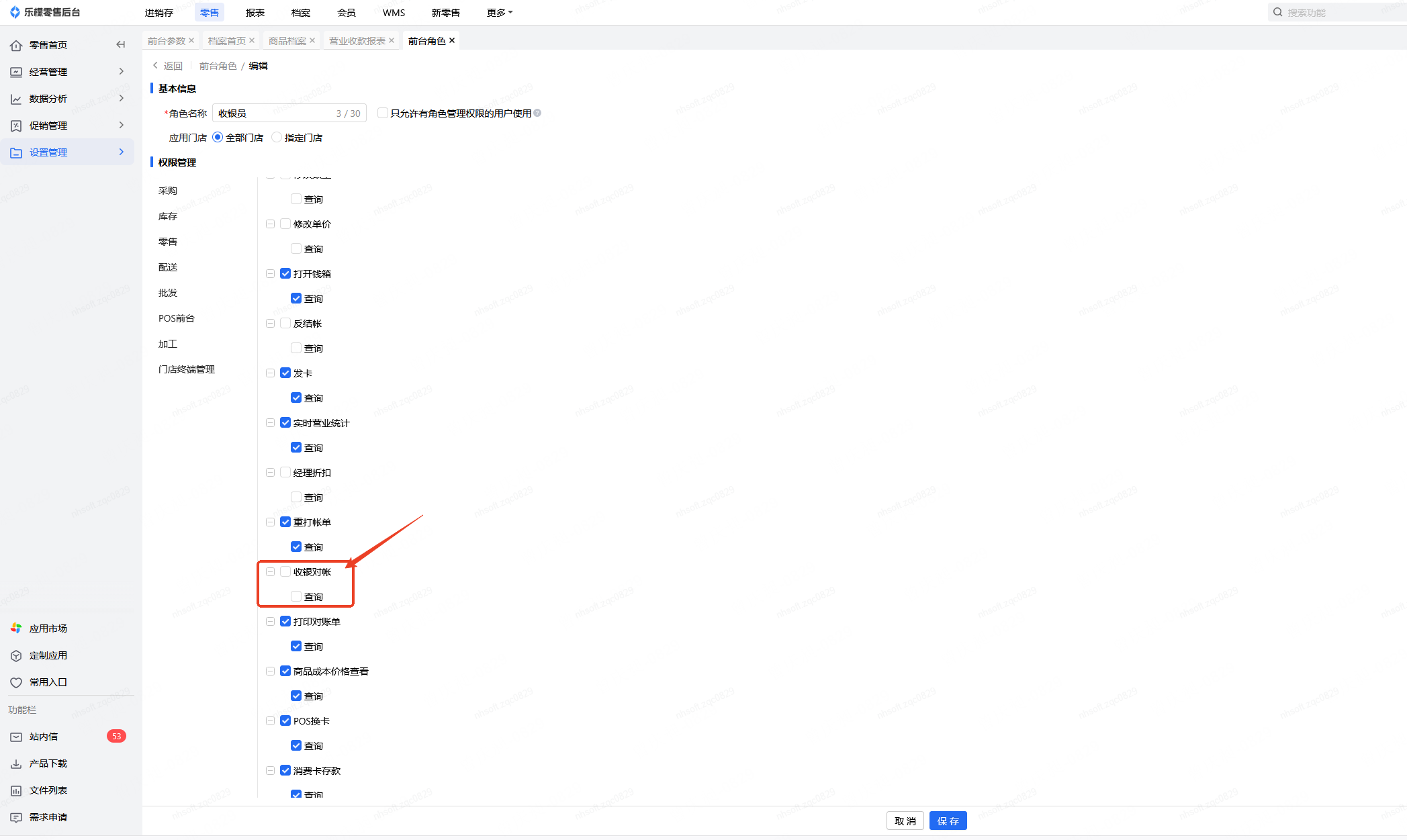 若开启交班需要录入现金的参数,建议关闭收银员角色”收银对账“的权限(盲交班),收银对账权限开启时,收银员可以在交班界面查看到本班次收款方式汇总