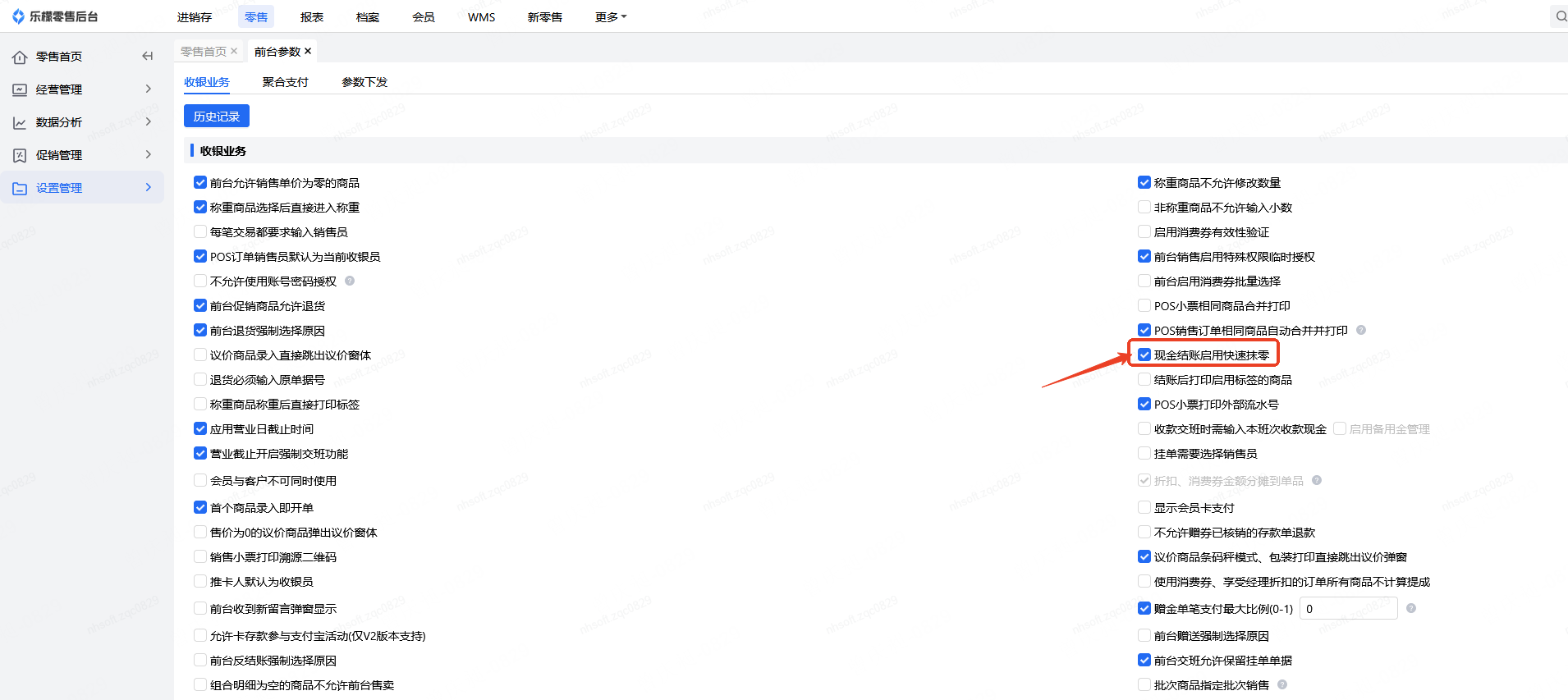 👉【操作路径】:零售-设置管理-前台参数-现金结账启用快速抹零