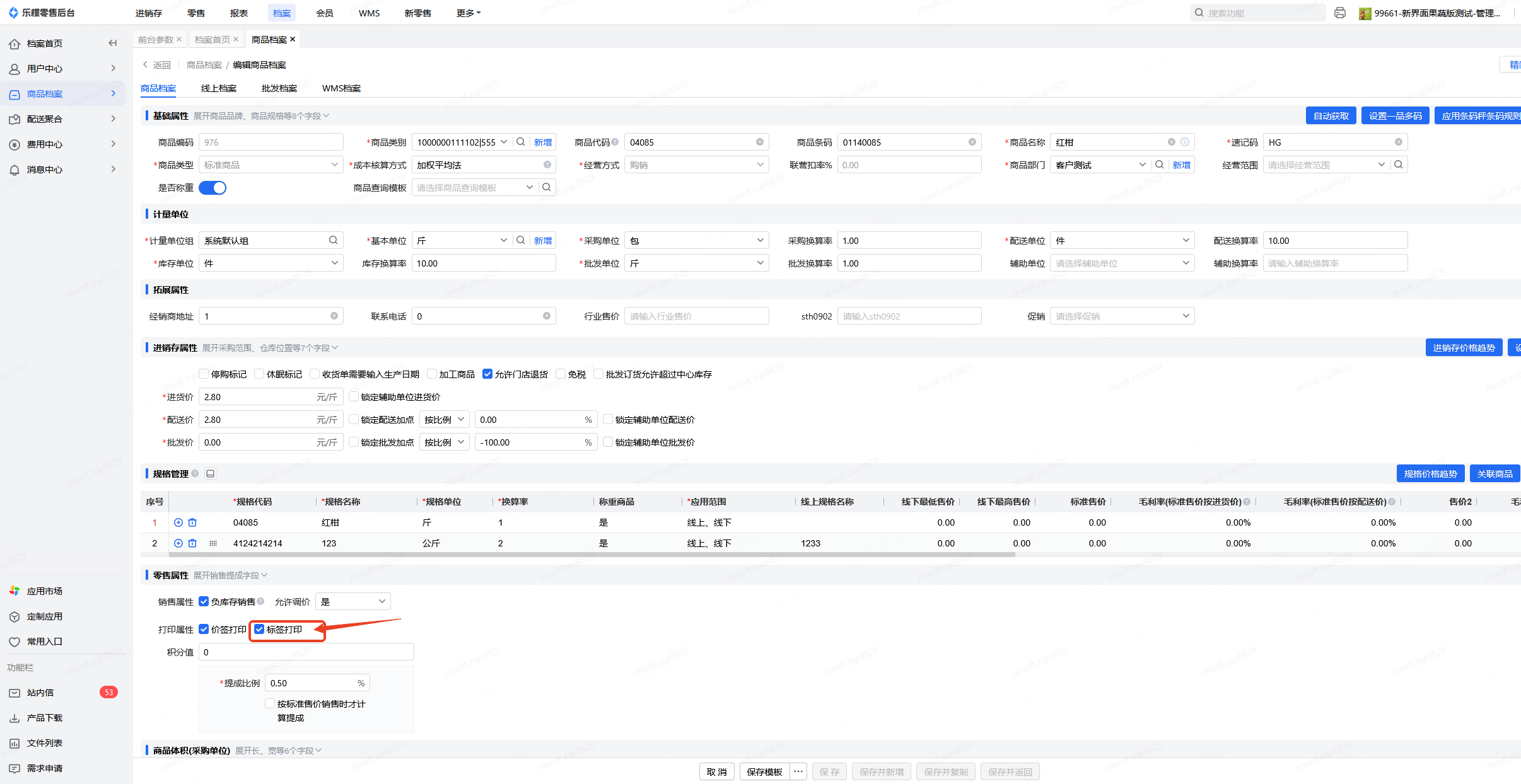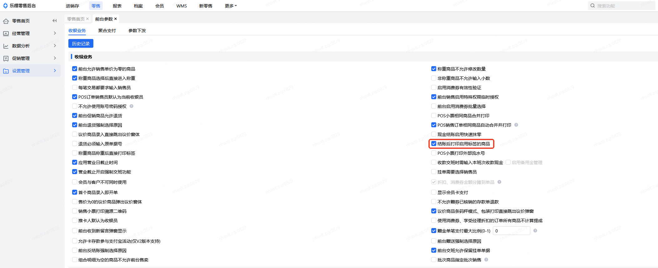 👉【操作路径】:零售-设置管理-前台参数-结账后打印启用标签的商品