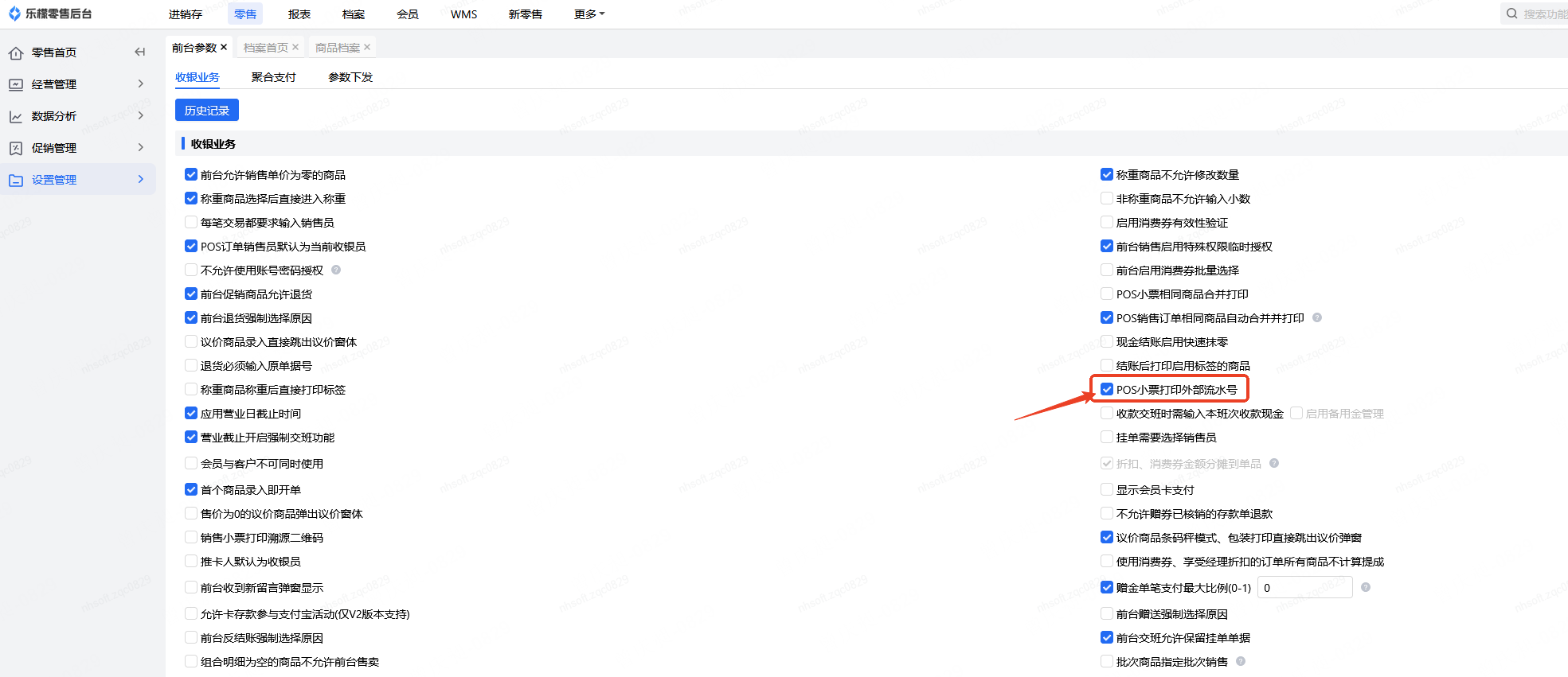 👉【操作路径】:零售-设置管理-前台参数-POS小票打印外部流水号
