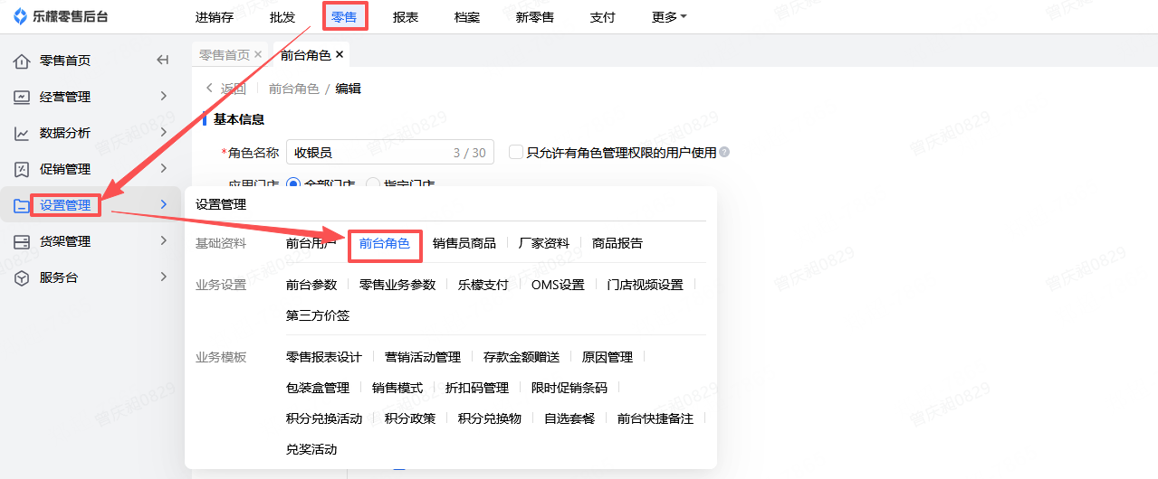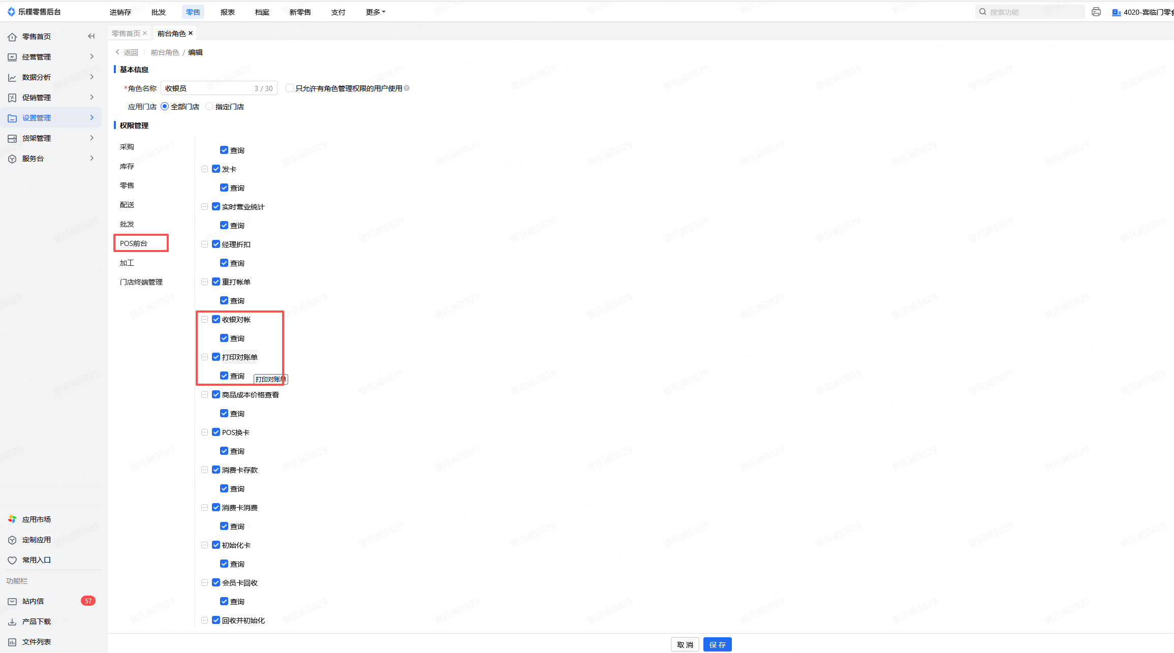 👉【操作路径】:零售-设置管理-前台角色-POS前台-打印对账单