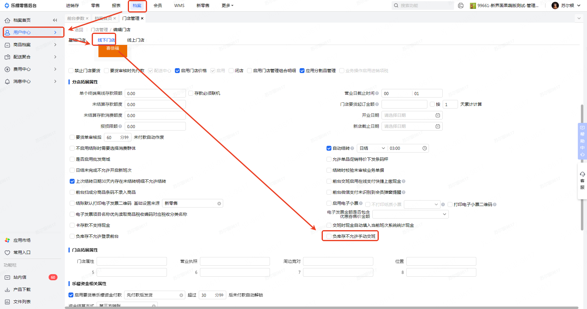 👉【操作路径】:档案-用户中心-门店管理-负库存不允许手动交班