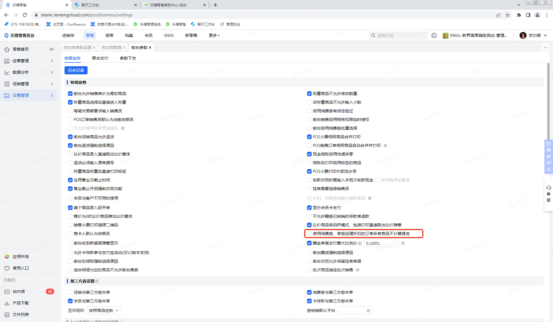 👉【操作路径】:零售-设置管理-前台参数-使用消费券、享受经理折扣的订单所有商品不计算提成
