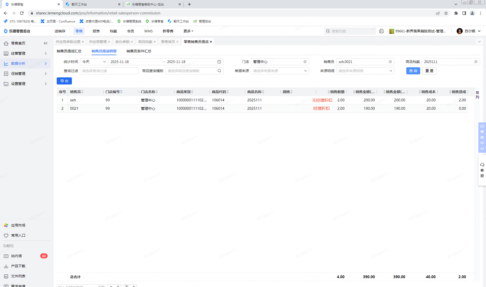 销售员0021开启参数时使用了经理折扣,未获得提成