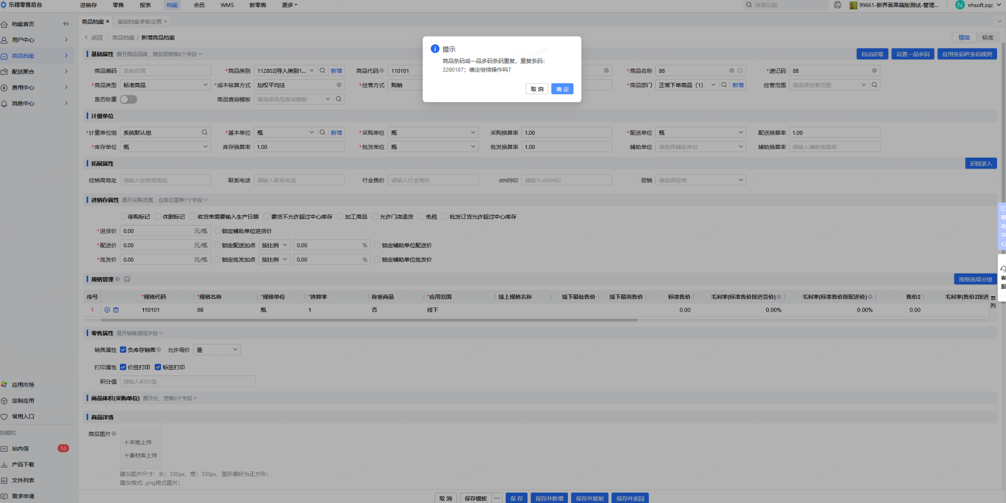2、未勾选参数时,新增商品的时候还是会提示条码已存在,直接点“确定”即可