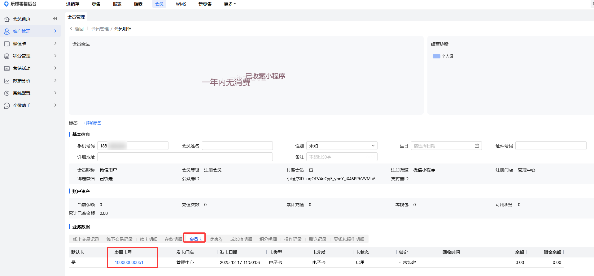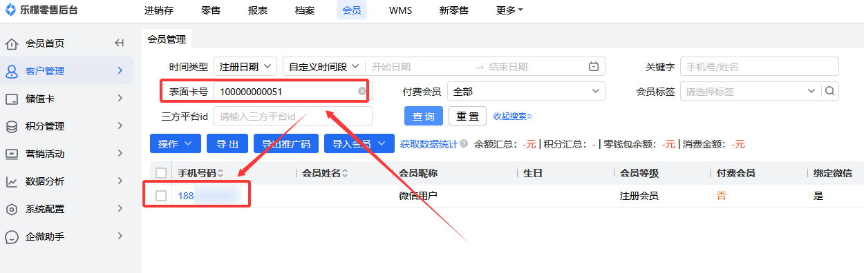 输入用户的会员卡号,点击查询,即可查看到客户的手机号码