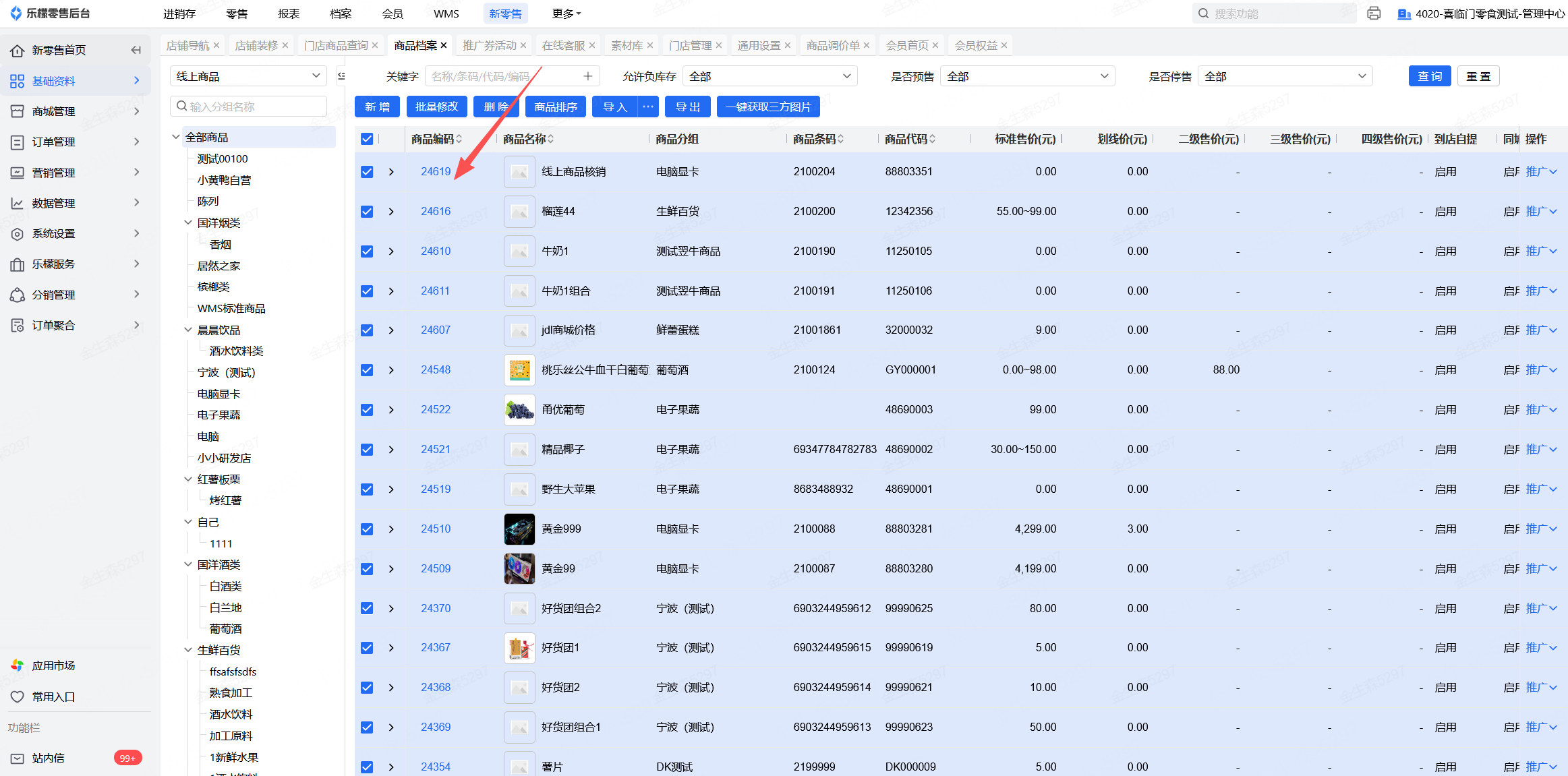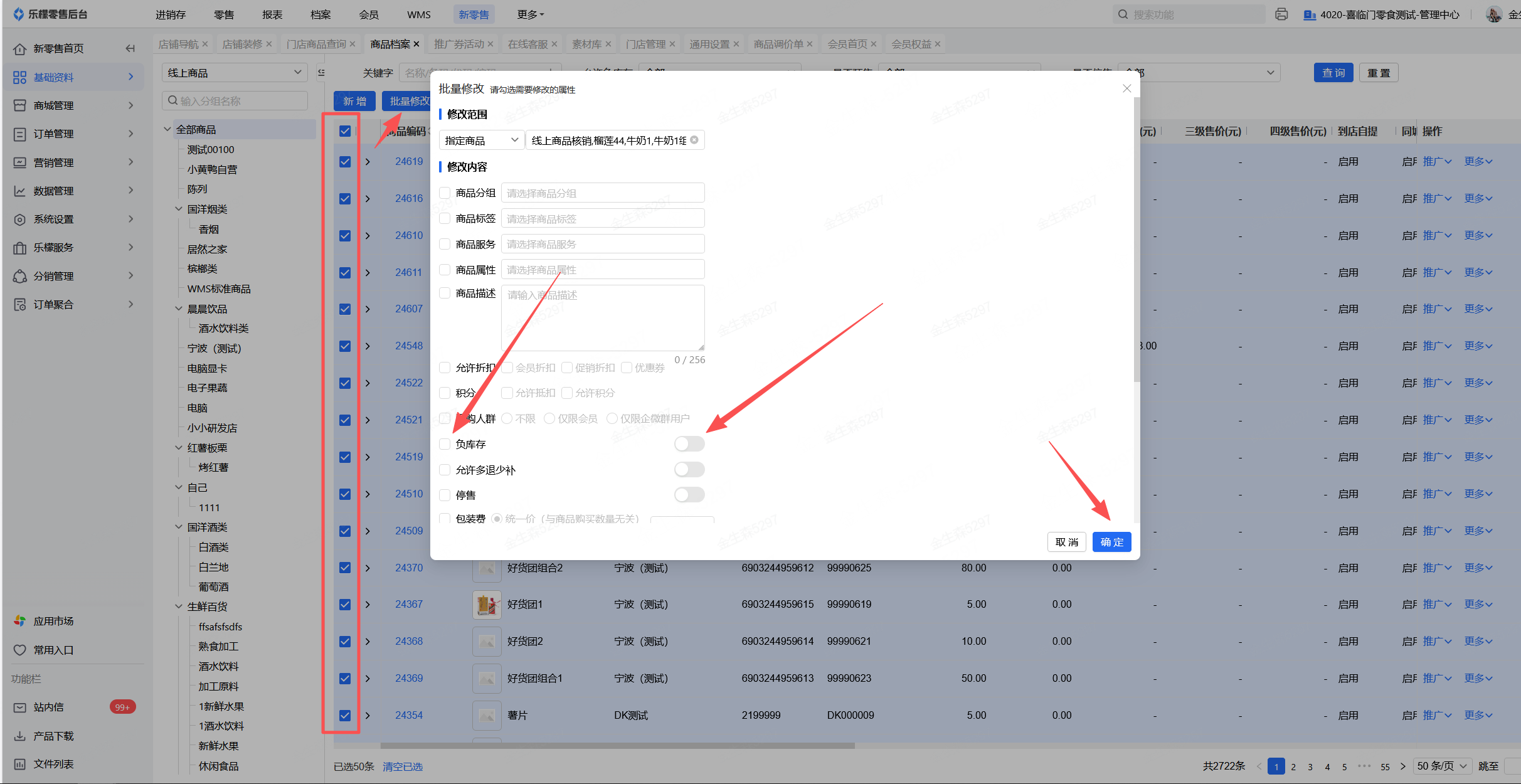 若需要多个商品快速处理,可在商品库处勾选需要调整的商品后点击“批量修改”进行快速启用/关闭允许负库存