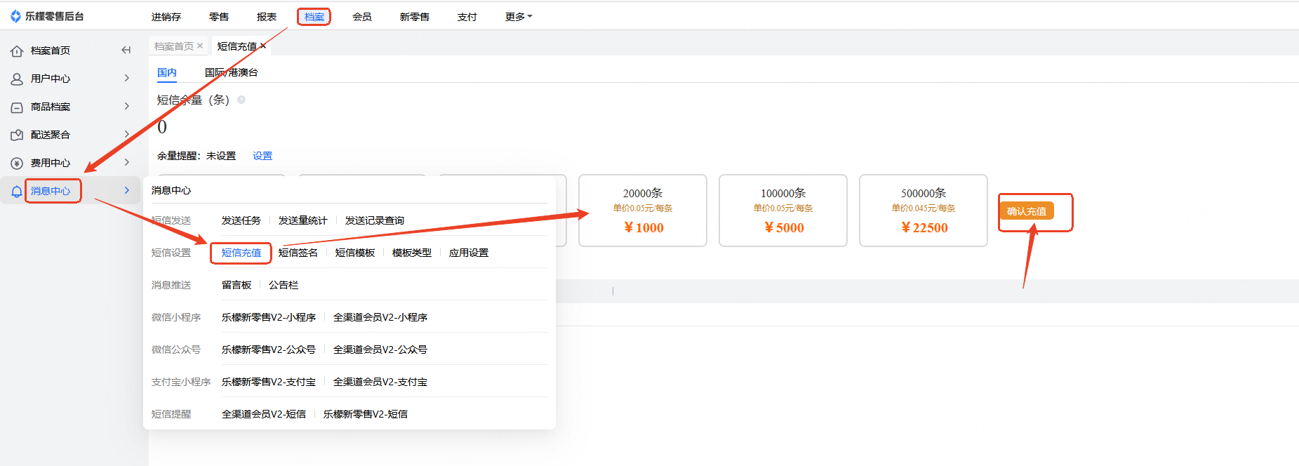 👉【操作路径】:档案-消息中心-短信充值
