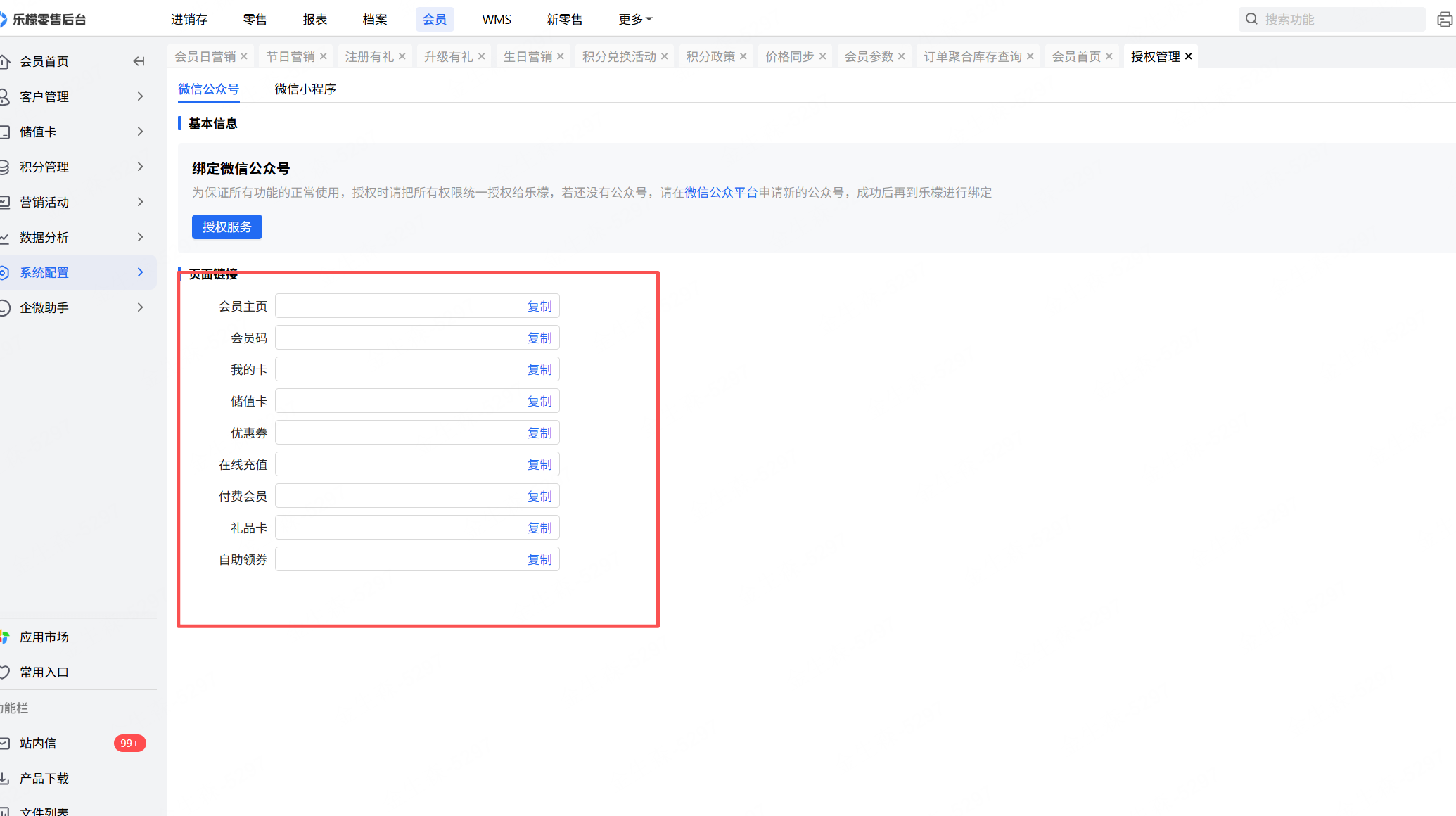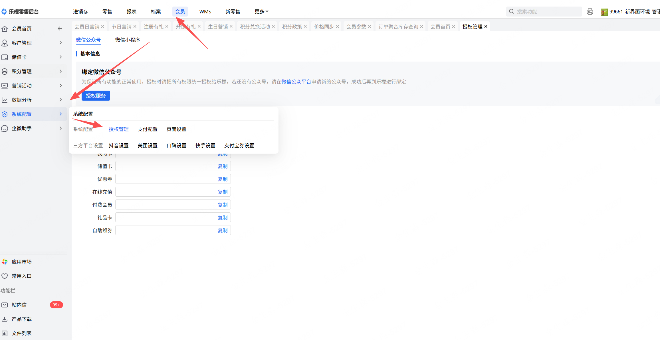 公众号/H5菜单链接、微会员菜单链接可在会员-系统配置-授权管理中获取