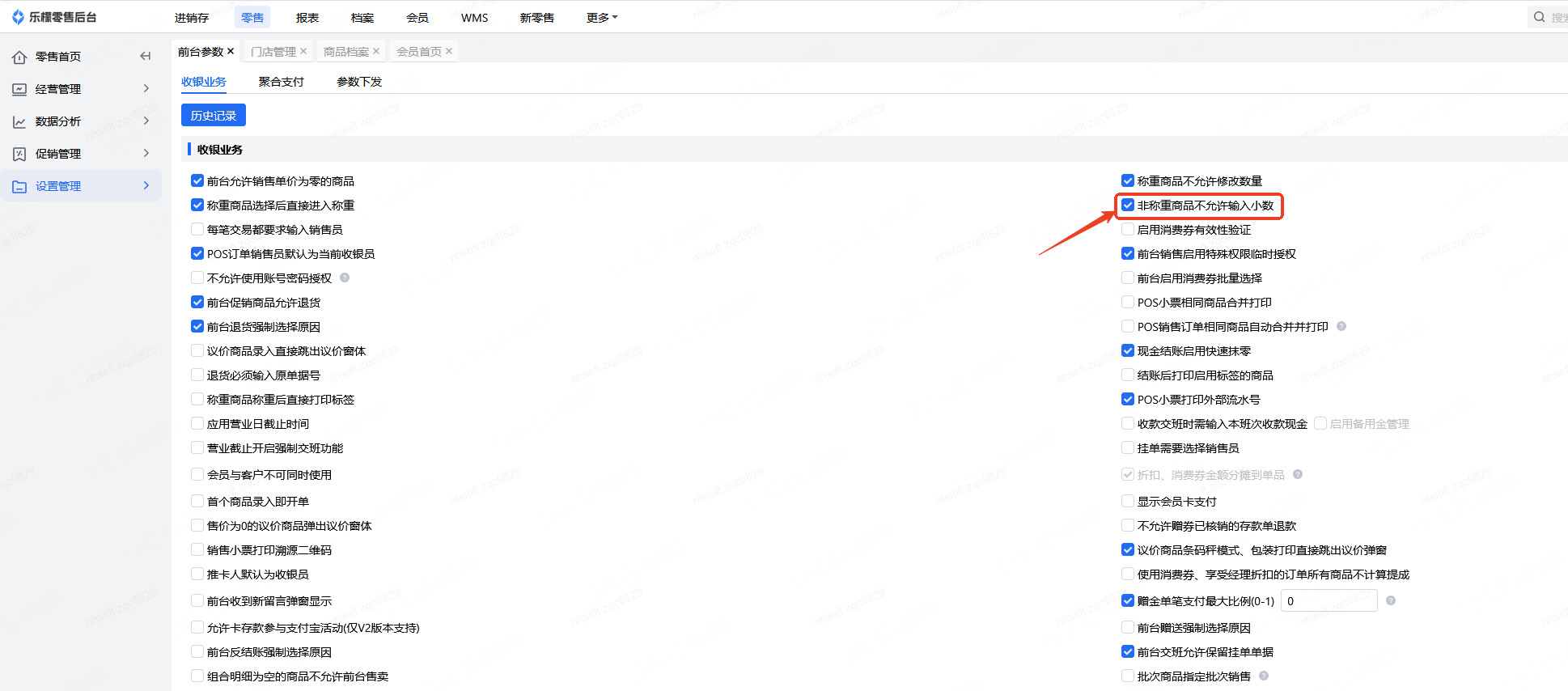 👉【操作路径】:零售-设置管理-前台参数-非称重商品不允许输入小数