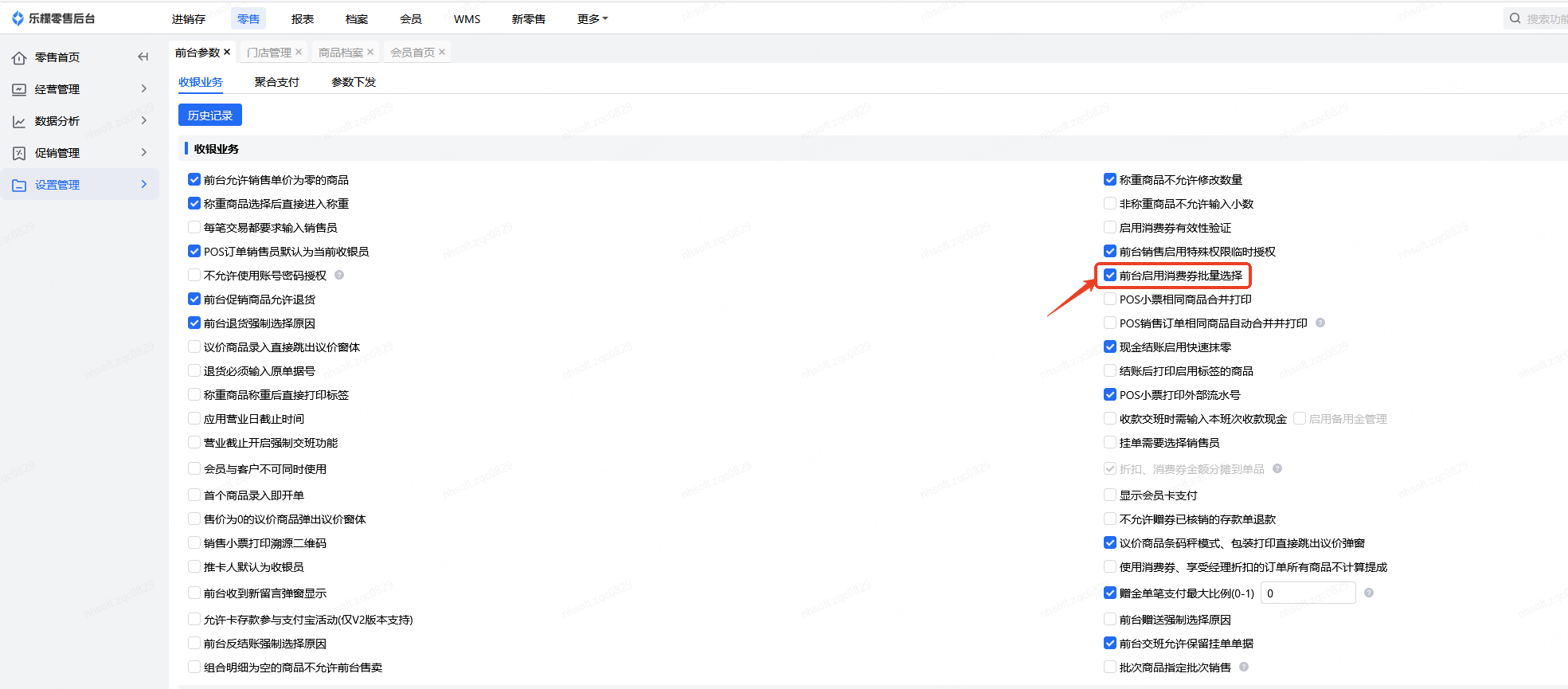 👉【操作路径】:零售-设置管理-前台参数-前台启用消费券批量选择