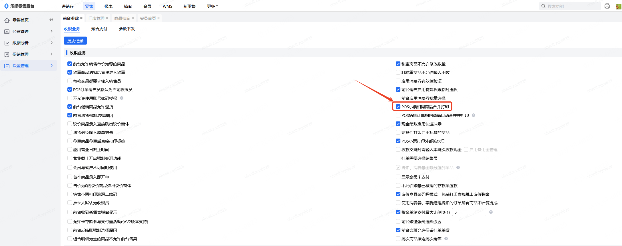 👉【操作路径】:零售-设置管理-前台参数-POS小票相同商品合并打印